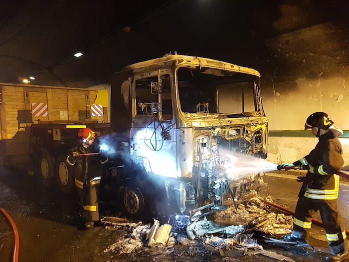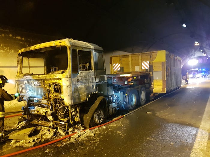 il camion di un trasporto eccezionale ha preso fuoco nella galleria Mottarone 1, al Km 185 + 100 della A26, sulla corsia nord. L'autostrada è rimasta chiusa fino alle 6 del mattino per consentire lo sgombero del pesante mezzo. Non ci sono feriti nè danni alla struttura. Il camion, di una ditta di Genova, trasportava un pesante macchinario industriale proveniente dall'India quando, per cause non ancora chiare, anche se l'ipotesi più accreditata parrebbe quella di una perdita di olio, dalla cabina di guida sono divampate le fiamme. L'autotrasportatore, un 53enne di Genova, ha fatto in tempo a scendere e ad allertare i soccorsi. Sul posto la Polstrada di Romagnano, il 118 (in via precauzionale), personale Anas e i Vigili del fuoco del comdnao di Verbania, chiamati anche a mettere in sicurezza l'area interessata dal rogo. Particolarmete complessa è stata l'operazione di spostamento del pesante mezzo e del suo carico, operazione che ha richiesto la chiusura dell'autostrada fino alle 6, quindi il ripristino della circolazione in galleria, in un primo momento, a senso unico alternato.