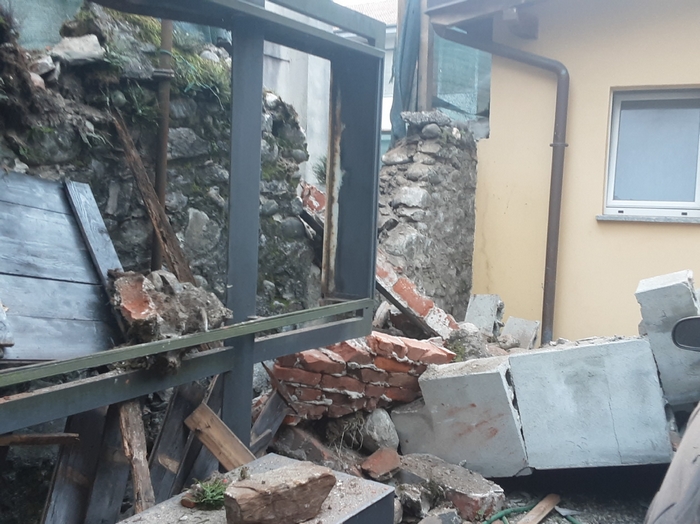 i danni riportati dal crollo, in una proprietà privata, di materiale edile proveniente dal cantiere del San Pallanza resort di Pallanza. L’incidente. Le foto che mostriamo ci sono state fornite dal presidente della società cooperativa Rinascita, che gestisce il vicino circolo. Il distacco s’è verificato nella zona retrostante l’ex cinema Sociale di Pallanza, dove c’è l’ingresso del bar-ristorante del Circolo Arci. È stata danneggiata un’automobile, il tetto dei bagni, è stata colpita la cabina Enel e, parzialmente, quella con i contatori di Acqua Novara-Vco. Ieri sul posto è intervenuta la polizia locale e, per accertare le violazioni delle norme di sicurezza sul cantiere, il servizio Spresal dell'Asl Vco.