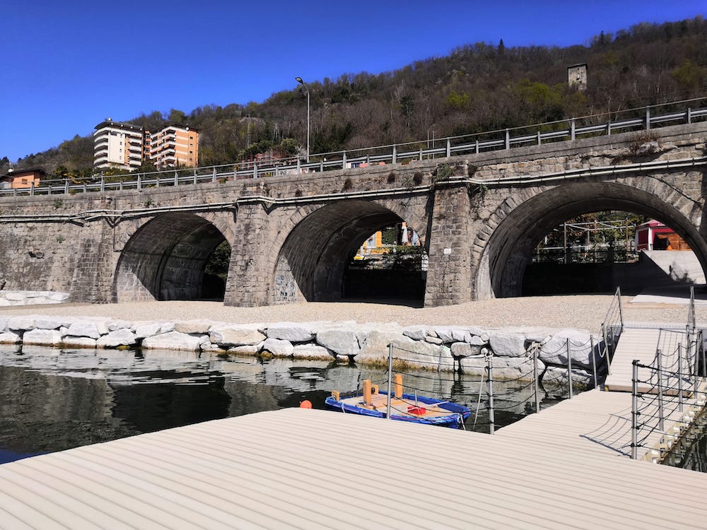 La spiaggia dei Tre Ponti è stata ampliata nella zona davanti alle arcate della strada statale 34 e gradualmente, si riduce in ampiezza proseguendo verso est, con un percorso pedonale retrostante. L’accesso principale è dal nuovo parcheggio, mentre un secondo accesso collega la nuova pista ciclabile in costruzione al percorso di riva. Sono state inserite una scogliera frangiflutti ed isolotti con pietrame e vegetazione igrofila interventi di riqualificazione dell’aree a verde esistenti e vegetazione di nuovo impianto oltre al posizionamento di una piattaforma per la balneazione.