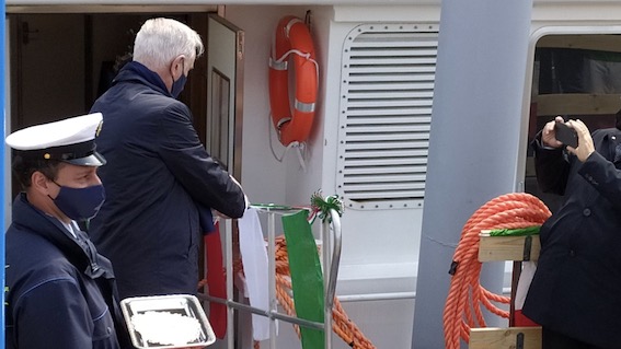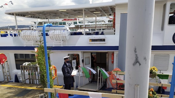 ARONA - 16-04-2021 -- Presentata venerdì 16 aprile ad Arona la prima motonave ibrida/diesel "Topazio" in servizio nelle acque interne Italiane. La presentazione è avvenuta alla presenza dei vertici di Navigazione Laghi.