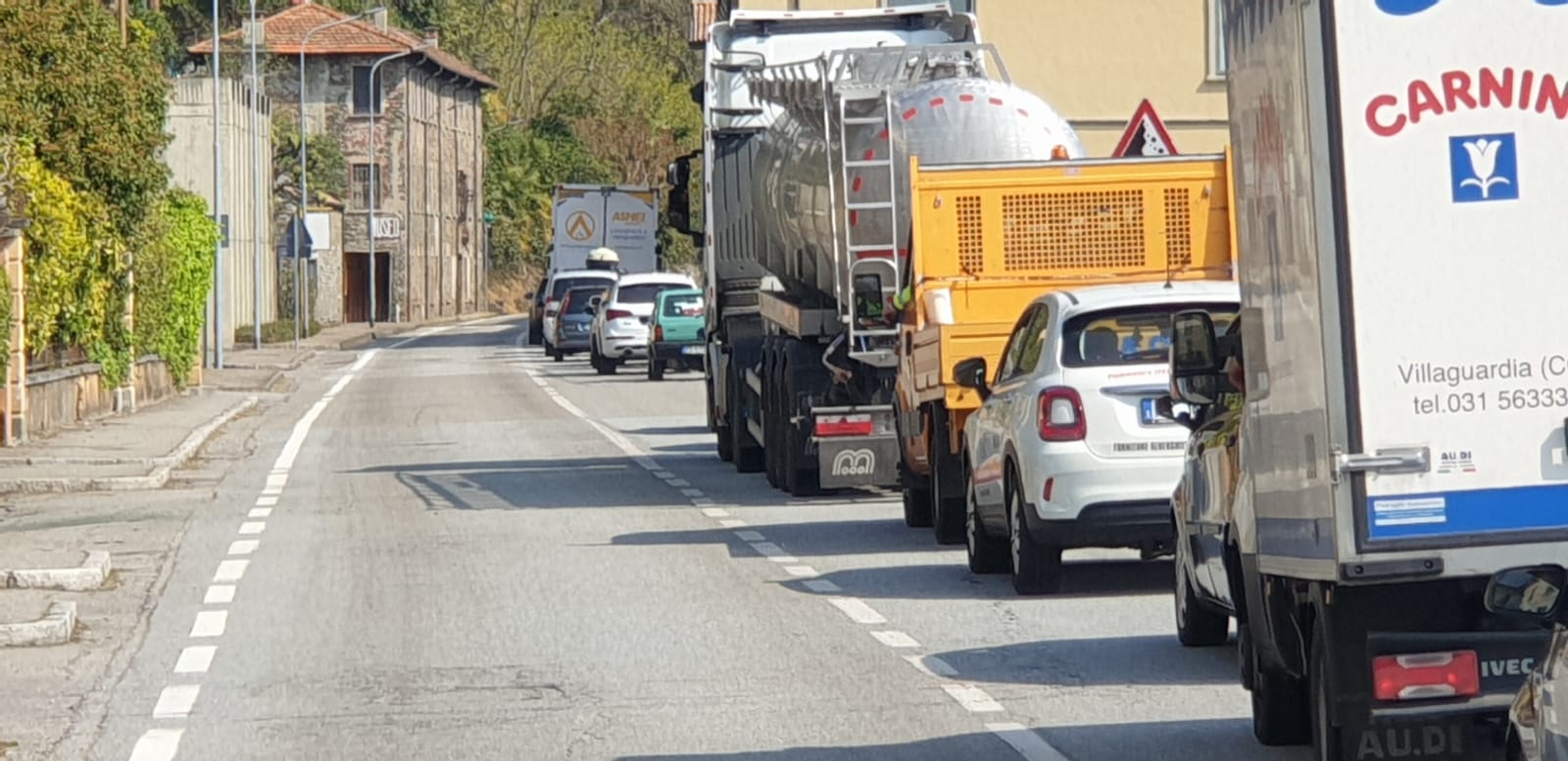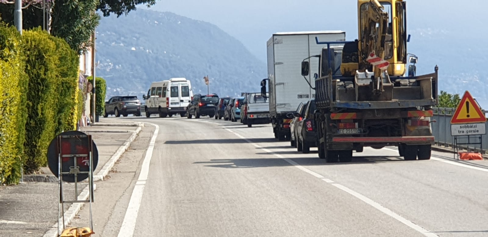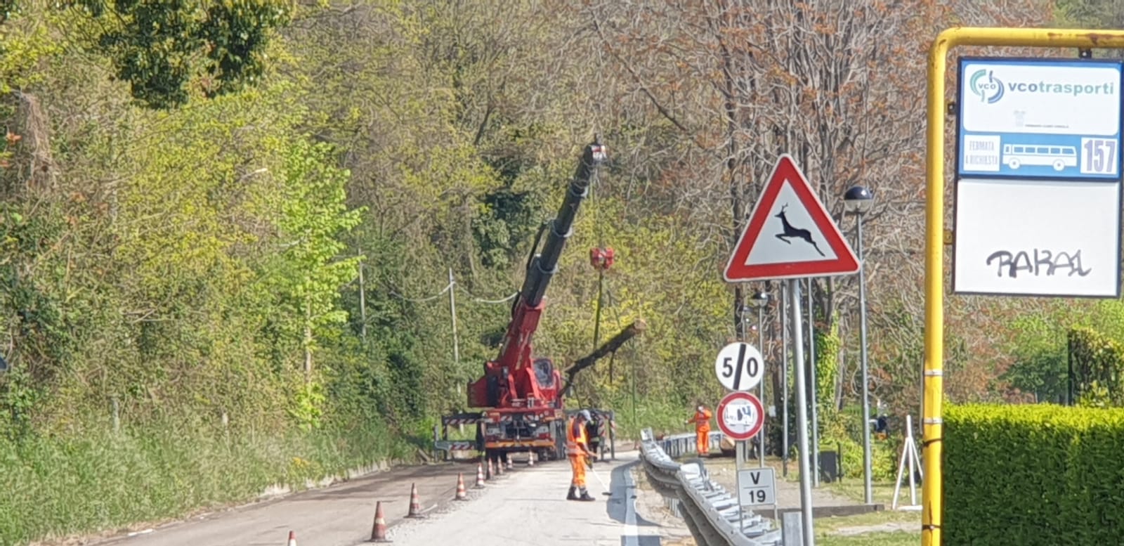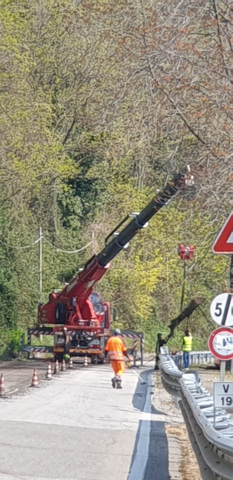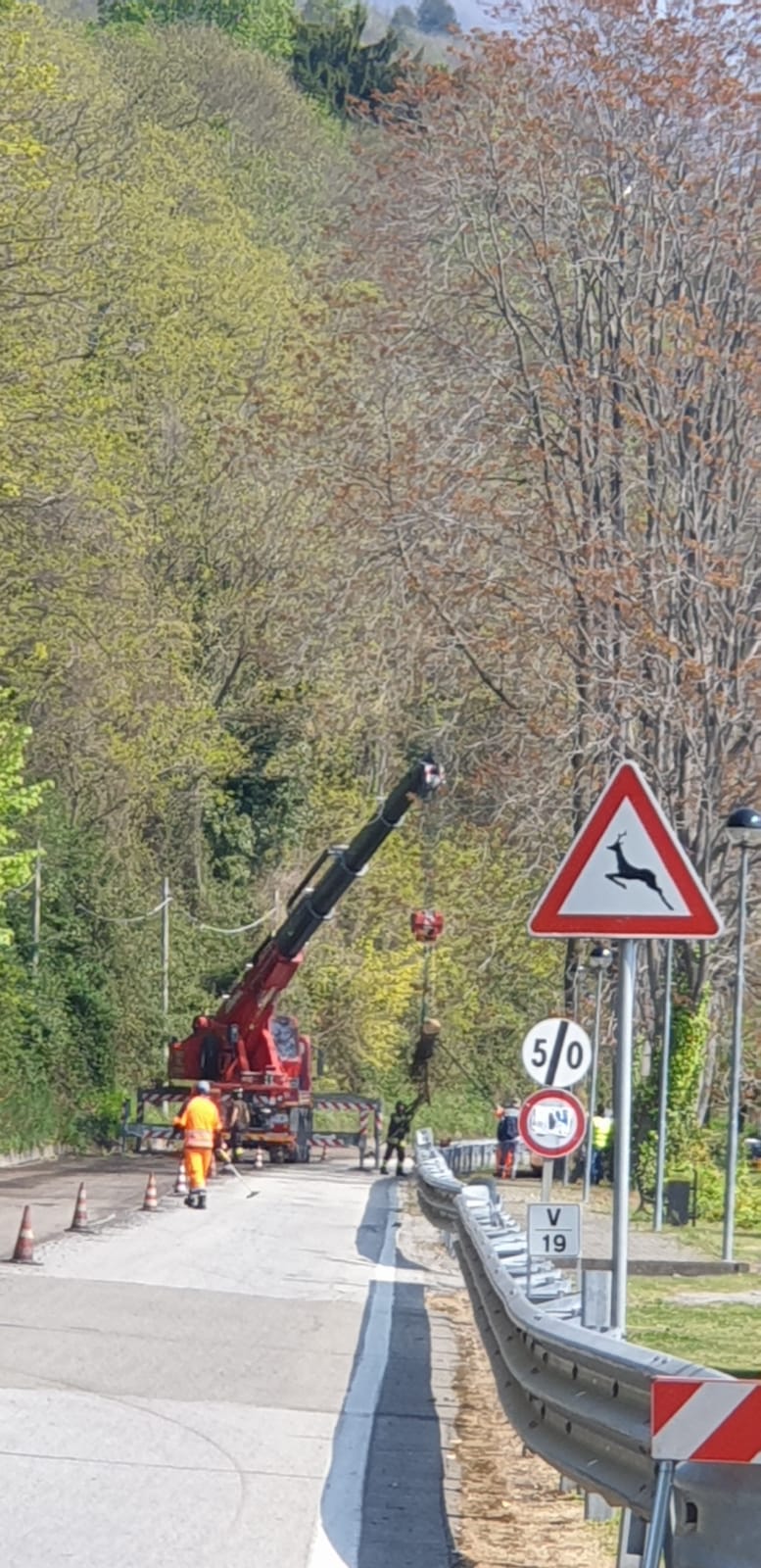 GHIFFA - 23.04.2021 - Taglio piante sulla Statale 34, nel territorio di Ghiffa. Nei pressi del residence Panizza dalle 11 circa i Vigili del Fuoco sono in azione con una autogru per rimuovere alberi pericolanti. L'operazione ha provocato l'interruzione del traffico per poco meno di un'ora, con la conseguente formazione di code.