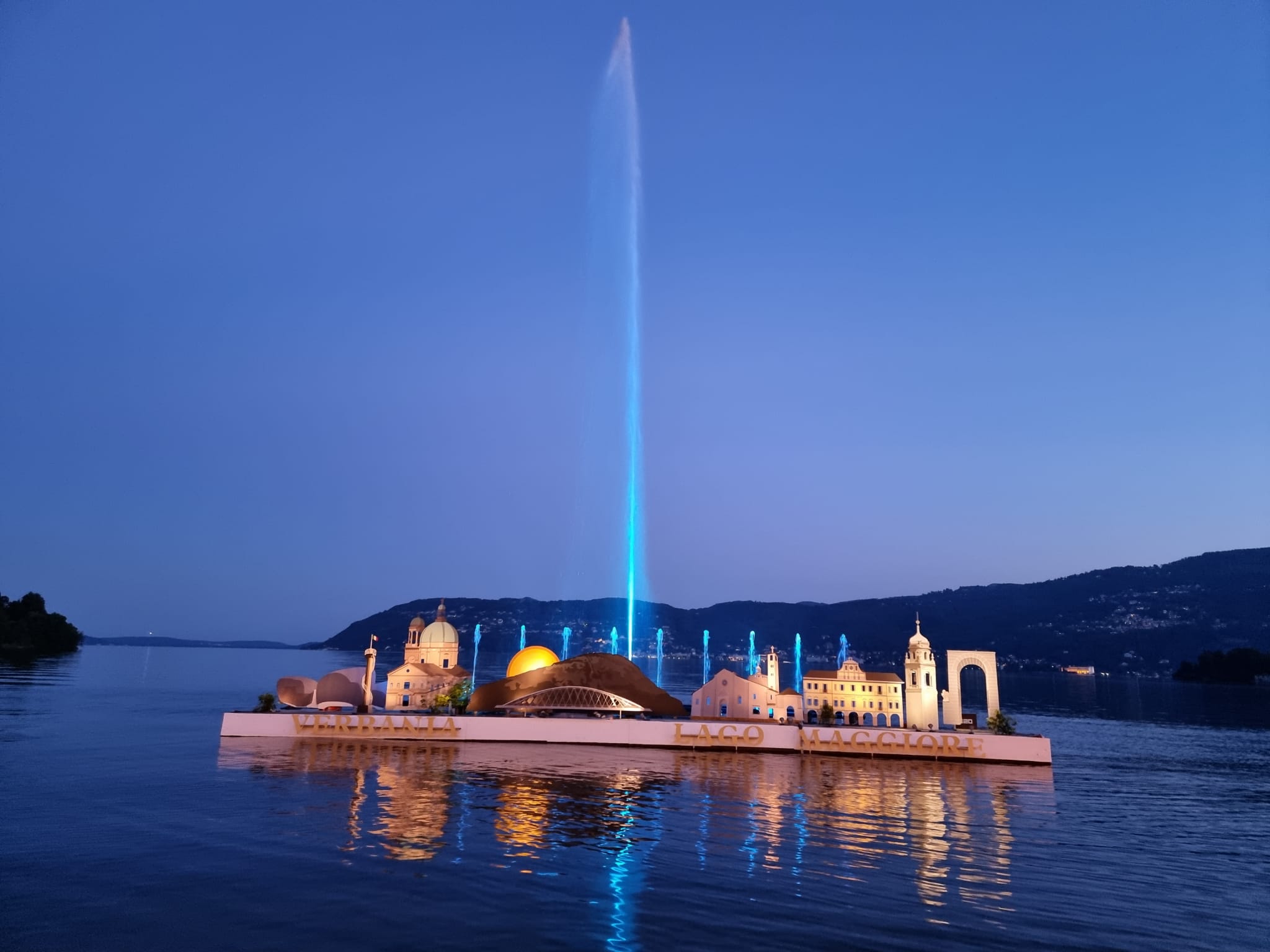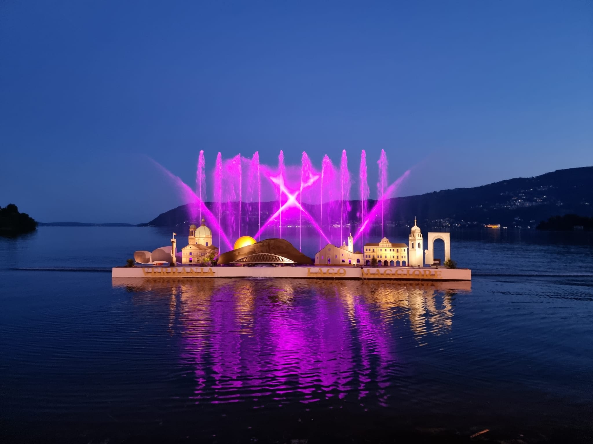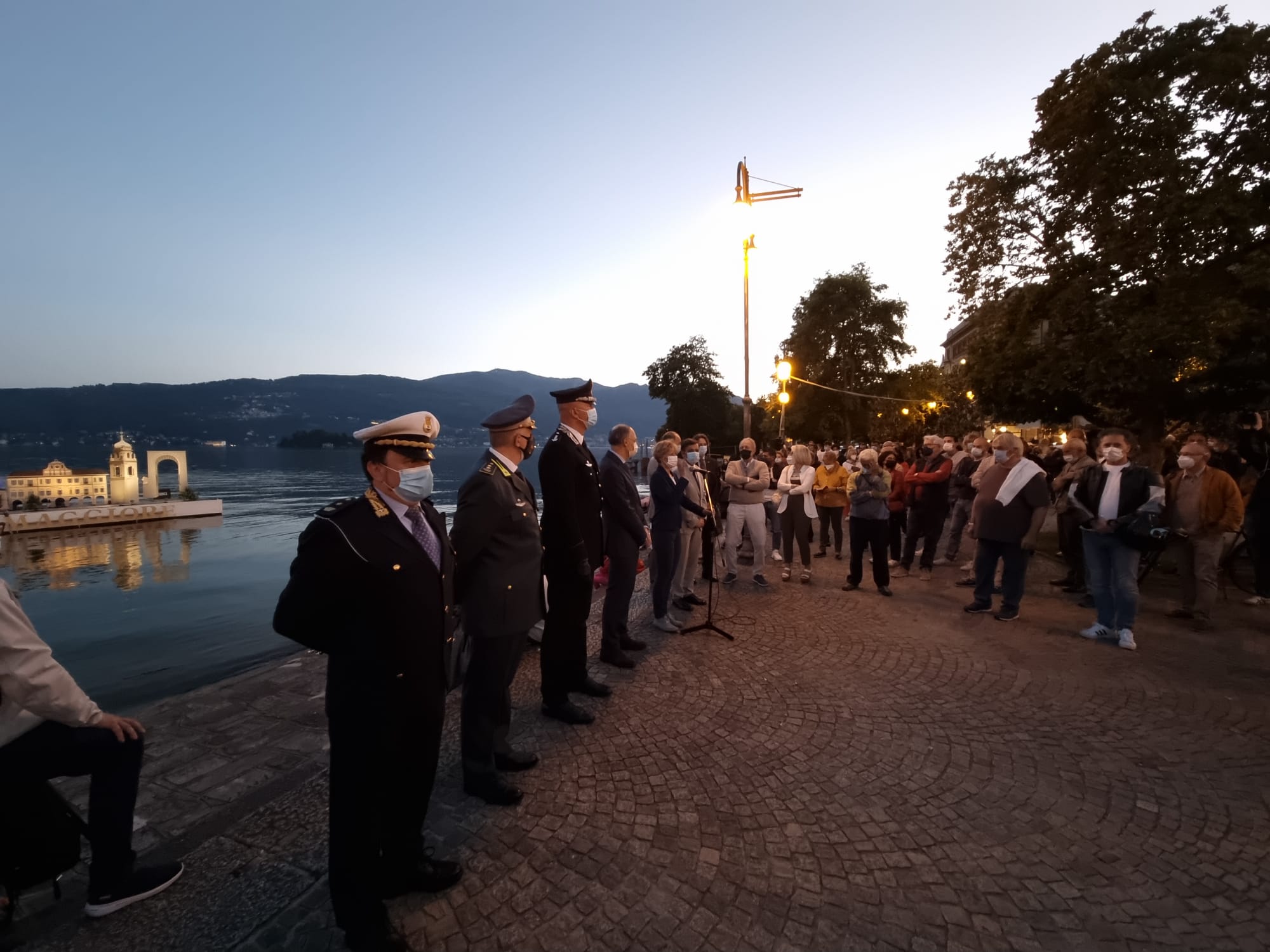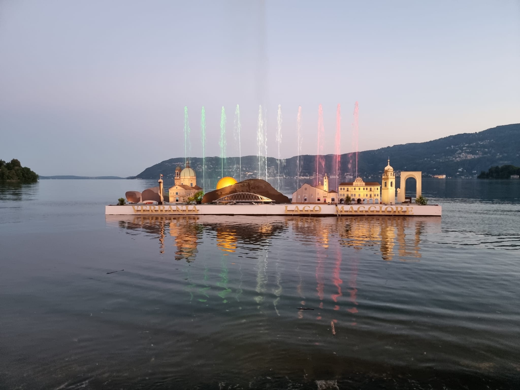 VERBANIA - 28-05-2021 -- Un getto tricolore accompagnato dalle note dell’Inno di Mameli. c’è stato anche un momento di raccoglimento per ricordare la tragedia avvenuta domenica al Mottarone nell’evento che l’Amministrazione verbanese ha tenuto ieri sera in piazza Garibaldi, a Pallanza. Col calare delle tenebre il sindaco Silvia Marchionini, parte della sua giunta, il prefetto e i rappresentanti delle forze dell’ordine hanno partecipato alla sobria cerimonia che ha inaugurato la fontana galleggiante allestita davanti alla passeggiata di corso Garibaldi, che manda al cielo gli zampilli di 15 augelli, colorati da lampade a led. E' anche l'accoglienza al Giro d’Italia che domani sarà in città, ma anche una sorta di apertura della stagione turistica. Nel corso della serata è stato presentato anche il libro “Quando il Giro” scritto da Gianluca Trentini.