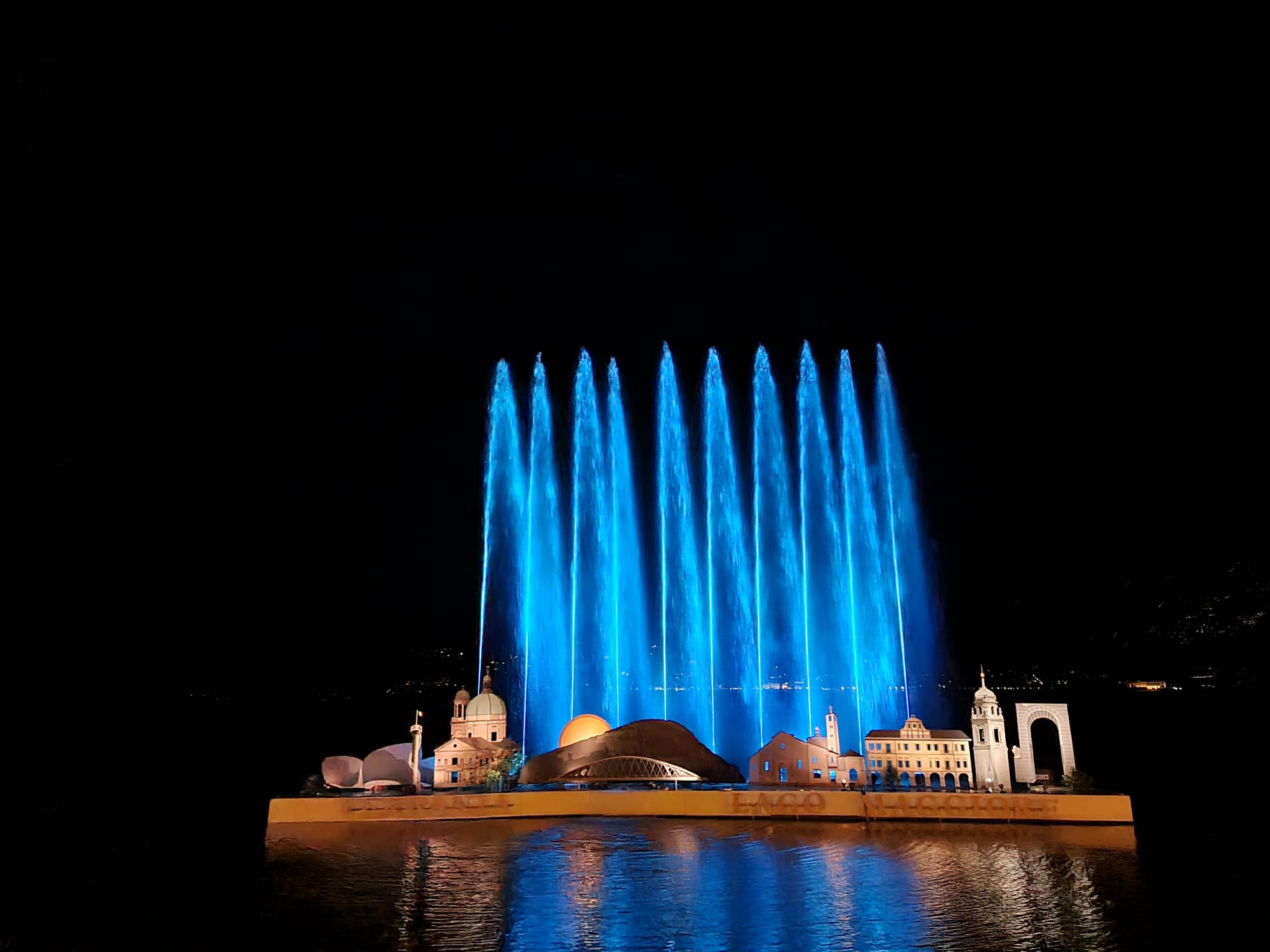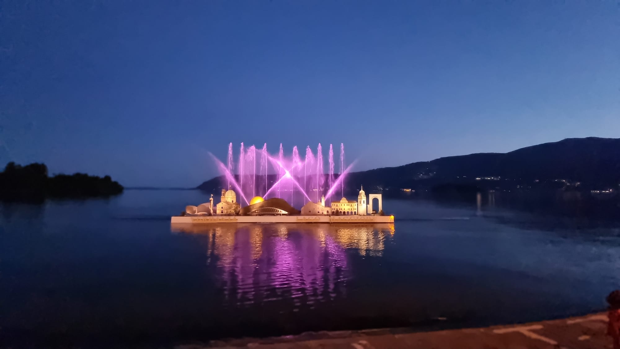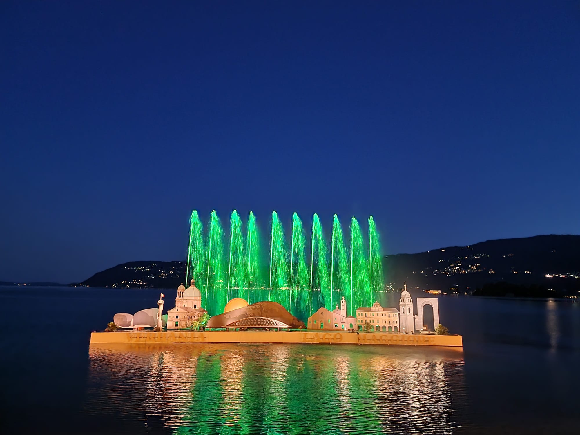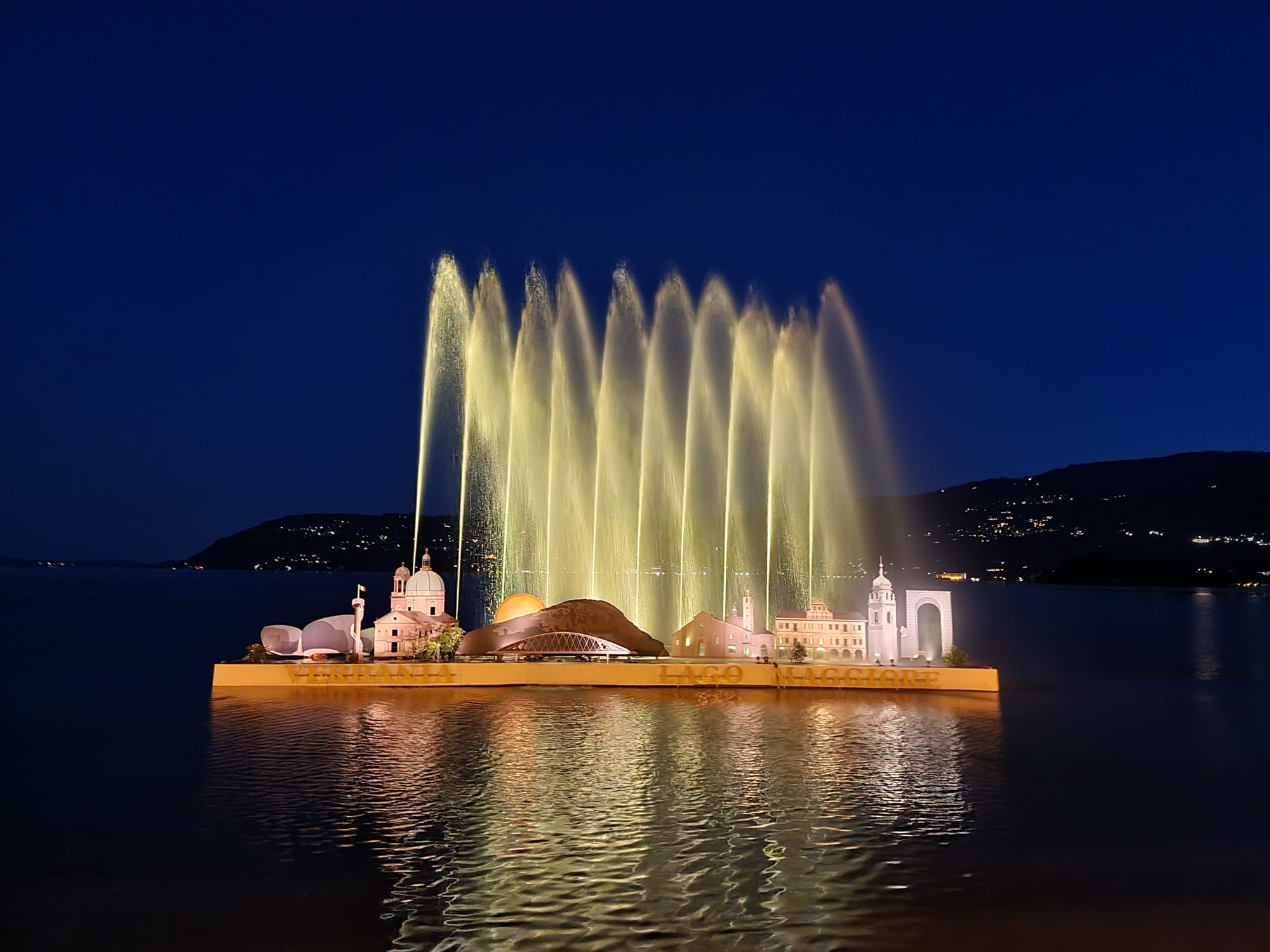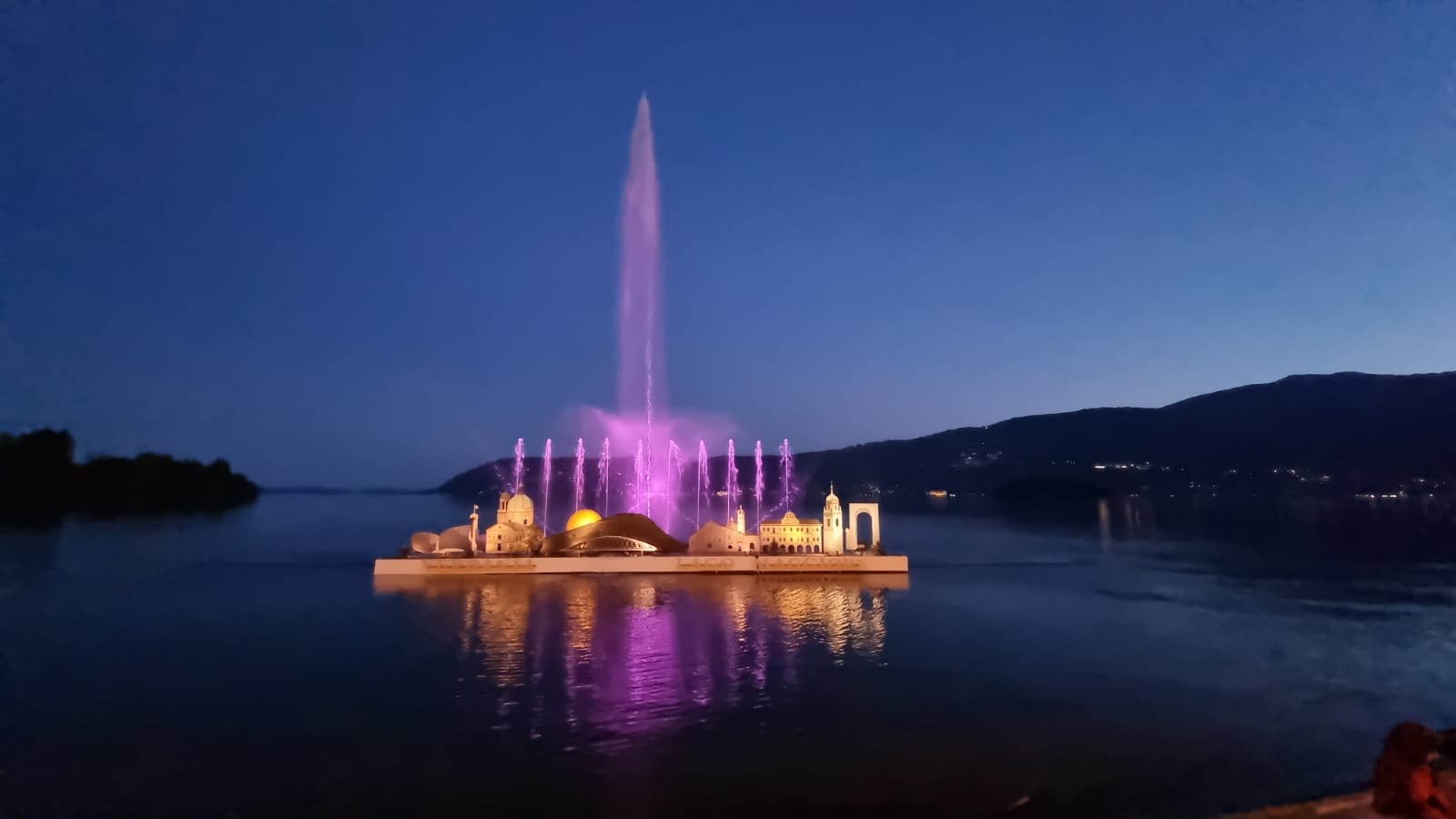 VERBANIA - 28-05-2021 -- Un getto tricolore accompagnato dalle note dell’Inno di Mameli. c’è stato anche un momento di raccoglimento per ricordare la tragedia avvenuta domenica al Mottarone nell’evento che l’Amministrazione verbanese ha tenuto ieri sera in piazza Garibaldi, a Pallanza. Col calare delle tenebre il sindaco Silvia Marchionini, parte della sua giunta, il prefetto e i rappresentanti delle forze dell’ordine hanno partecipato alla sobria cerimonia che ha inaugurato la fontana galleggiante allestita davanti alla passeggiata di corso Garibaldi, che manda al cielo gli zampilli di 15 augelli, colorati da lampade a led. E' anche l'accoglienza al Giro d’Italia che domani sarà in città, ma anche una sorta di apertura della stagione turistica. Nel corso della serata è stato presentato anche il libro “Quando il Giro” scritto da Gianluca Trentini.