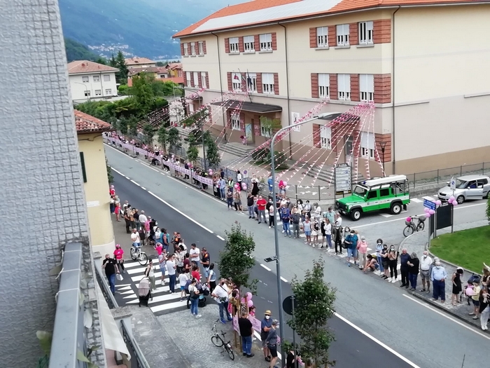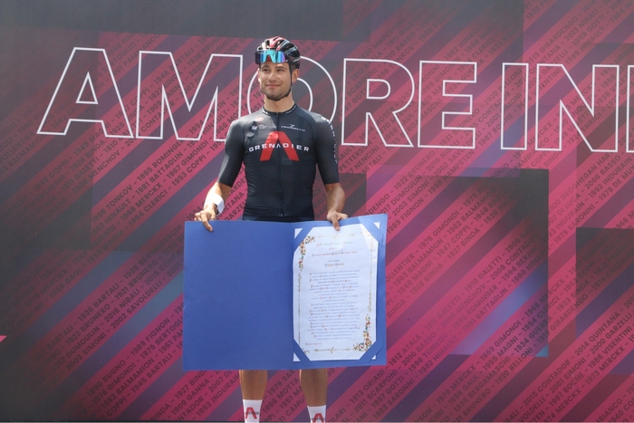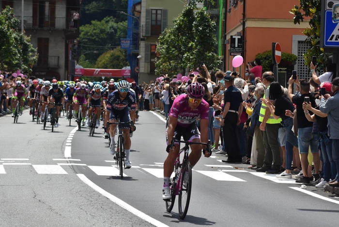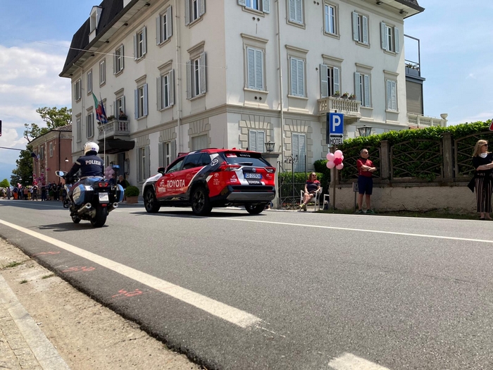 VERBANIA - 29-05-2021 -- È stato Filippo Ganna il protagonista del Giro d’Italia che stamane è partito da Verbania. Il campione del mondo a cronometro, già maglia rosa nell’edizione 2020 disputata in autunno, è stato calorosamente accolto non solo dai parenti, dagli amici e dai fan che sono scesi sul lungolago per salutarlo. A dargli il benvenuto, consegnandogli la pergamena di cittadino benemerito che non ha potuto ritirare lo scorso 8 maggio, giorno del patrono San Vittore, proprio perché impegnato al Giro, è stata l’Amministrazione comunale. Il rigido protocollo anti-Covid necessario per preservare gli atleti e le squadre e per garantire la sicurezza della competizione ha reso più difficoltose le operazioni ma, alla fine, Ganna ha mostrato dal palco l’attestato che lo riconosce come verbanese benemerito, anche se in realtà è cresciuto e vive a Vignone.