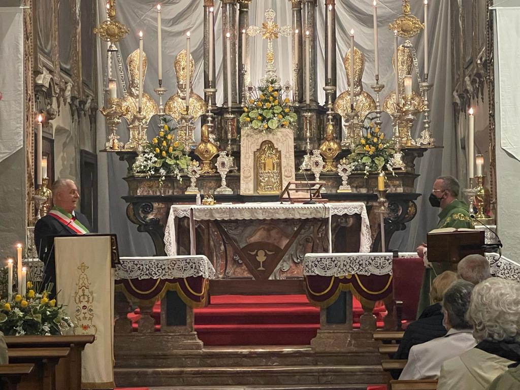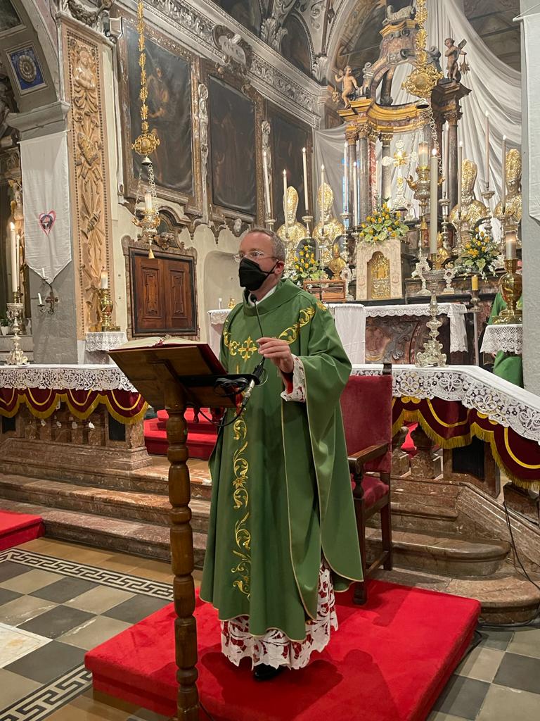 COSSOGNO - 06-10-2021 - Tutto il paese s'è mobilitato per accogliere don Marco Masoni, il nuovo parroco di Cossogno che domenica scosa ha celebrato la sua prima messa. Ad accoglierlo con un applauso c'erano il sindaco di Cossogno con il consiglio comunale e le associazioni del paese (tra cui il Gruppo Alpini, la Confraternita del Pane e la Protezione Civile).