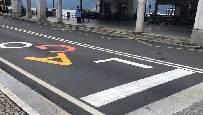 VERBANIA - 08-10-2021 -- Fa discutere, a Verbania, la nuova segnaletica orizzontale che da qualche giorno accompagna il tratto di lungolago vicino ai tre attraversamenti pedonali (quelli con il semaforo a chiamata) realizzati dell’Amministrazione all’interno degli interventi al Piano urbano del traffico. Le diciture “piazza”, “lago” e “porto” sono state dipinte con grandi lettere in stampatello di forma e disposizione irregolare e di colori diversi (bianche, ma anche gialle e arancioni) proprio a ridosso degli attraversamenti pedonali che, essendo in pietra, non hanno le classiche “zebre” bianche dipinte a terra.