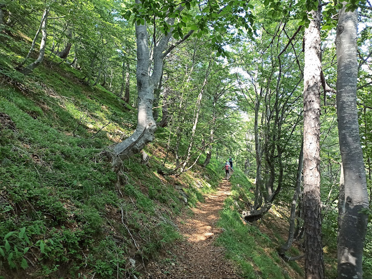 I saliscendi incrementano il modesto dislivello di oggi. Il bellissimo sentiero passa dai boschi di abete a quelli di faggio. Incrociamo il famigerato sentiero D14, citato in precedenza, passiamo dall’Alpe Ciupinella, 1542, ed arriviamo, lungo una pista in leggera salita, alla chiesetta di San Bernardo ed alle auto (un’ora e tre quarti da Oriaccia). Festeggiamo al rifugio un imminente e illustre triplice compleanno, delusi da cartine e segnali, ma soddisfatti della nostra attività di esploratori.