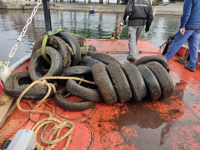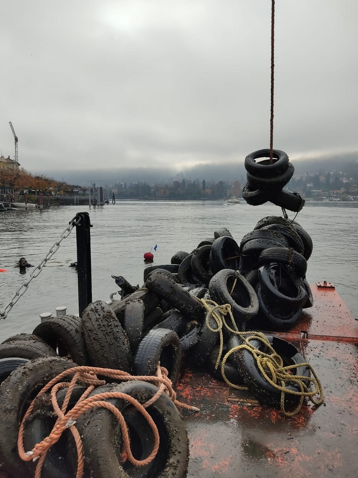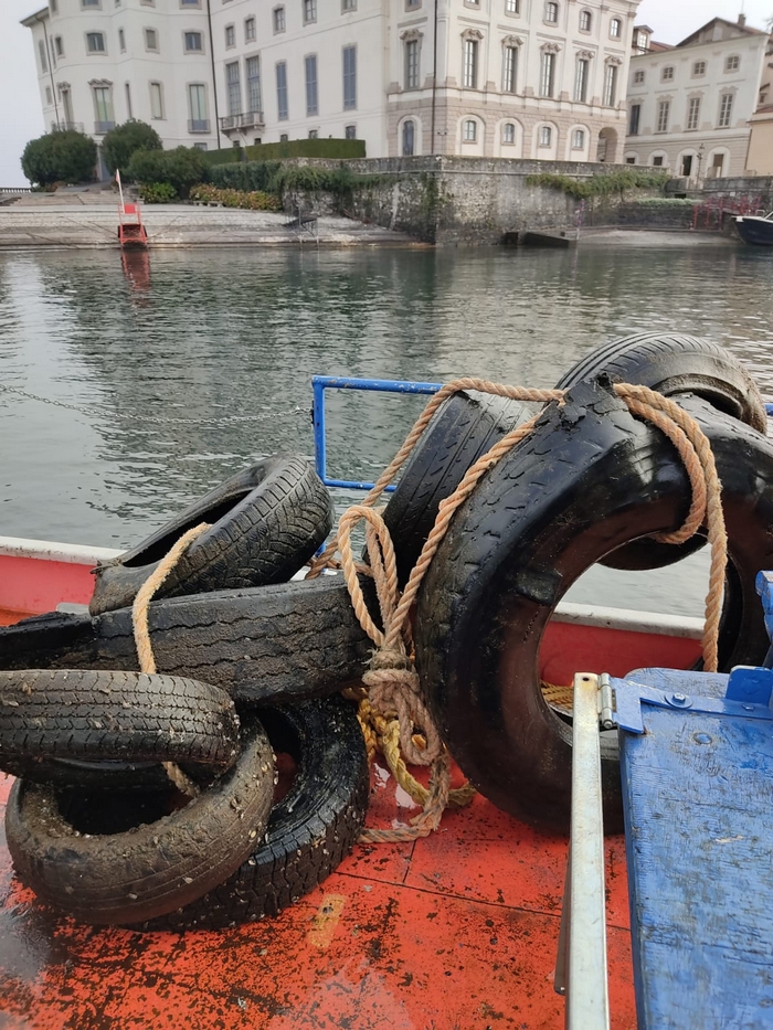 STRESA - 21-11-2021 -- Una montagna di pneumatici è stata ripescata ieri dai Sub Verbania, che hanno effettuato la pulizia dei fondali antistanti l’Isola Bella e l’Isola pescatori, recuperando in immersione e portando a galla sulla chiatta decine di gomme d’auto che saranno avviate in discarica.