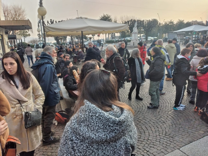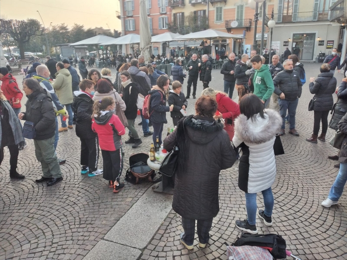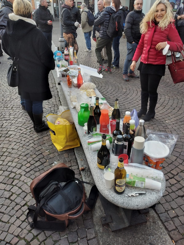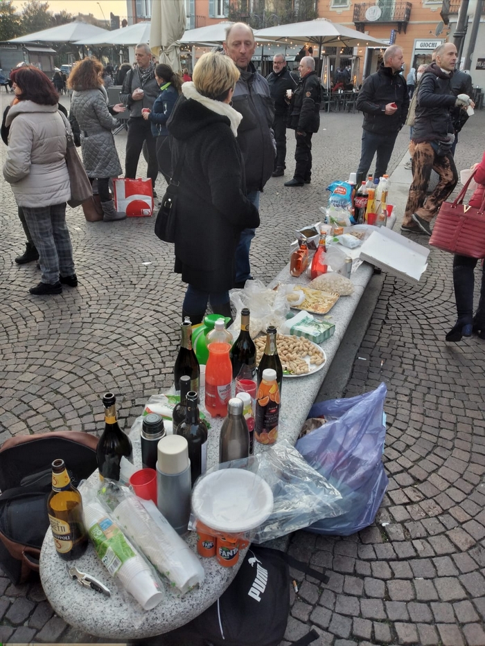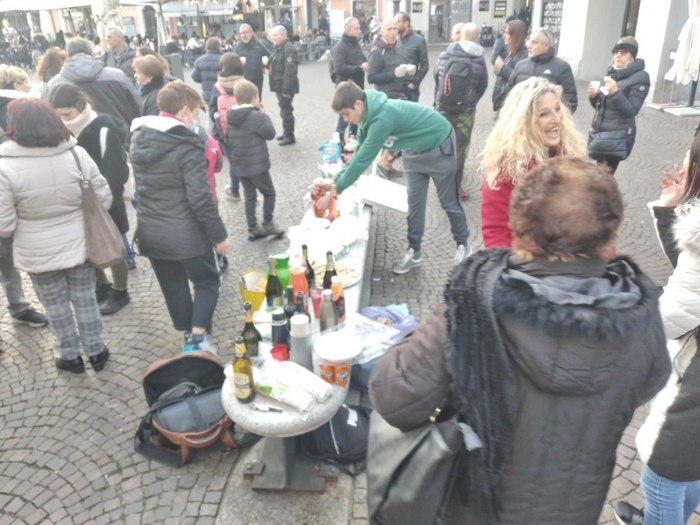 VERBANIA - 07-02-2022 -- L’appuntamento, concordato da qualche giorno, era stato promosso con il consueto tam-tam dei social network. L’aperitivo dei no-vax e dei no-green pass fissato per le ore 15,30 in piazza Ranzoni a Intra, ha visto presenti una trentina abbondante di persone, la maggior parte delle quali proveniente da fuori città e da fuori provincia. Gli astanti si sono accomodati sulle panchine di pietra, utilizzate a mo’ di tavolo, esponendo cibo e beveraggio vario che ciascuno, senza l’uso delle mascherine e non rispettando il distanziamento sociale, ha consumato liberamente mentre, in un angolo, c’era chi suonava la chitarra e cantava. Questa manifestazione improvvisata ha richiamato polizia e vigili urbani, che hanno richiamato gli organizzatori. La scena dei controlli, compreso quello in cui un ufficiale della polizia locale chiede l’esibizione dei documenti, è stata ripresa e postata sui social network, accompagnata da commenti negativi che parlano anche di abusi da parte della polizia locale.