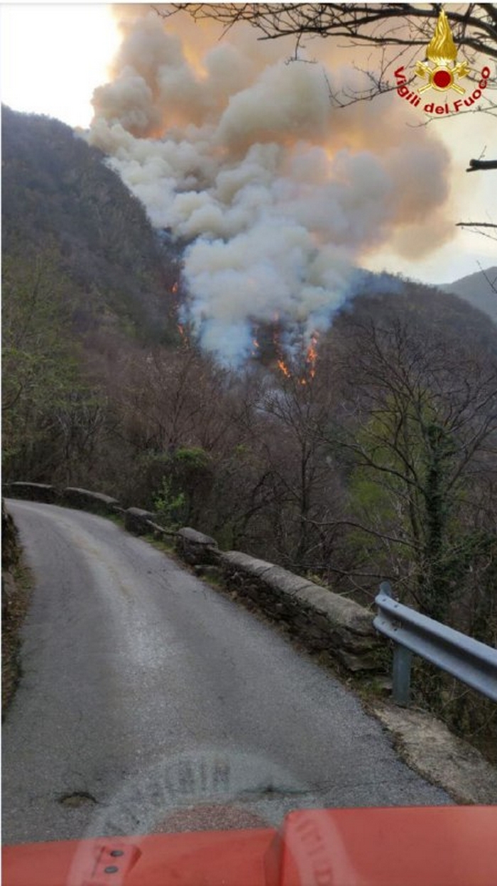 SAN BERNARDINO V. - 14-04-2022 -- Oltre cento ettari di bosco in fumo e una legnaia. È stato tenuto al di fuori dei confini del Parco nazionale della Val Grande e lontano da baite e rustici l’incendio che, da poco più di 24 ore, arde sui pendii del Verbano.