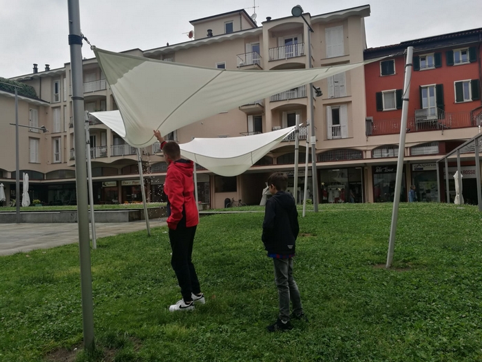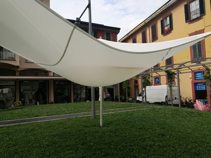 VERBANIA - 25-05-2022 -- È bastato un temporale per “gonfiare” le tende ombreggianti di largo Mariani, a Intra. A ottobre, con la chiusura dell’oneroso (88.678,92 euro di opere, 8.881,60 di progettazione) cantiere per il rifacimento dell’arredo urbano di questo scorcio di centro storico, Giove pluvio aveva mostrato i limiti strutturali delle due grandi “vele” piazzate nell’angolo meridionale, accanto al bersò su cui si sta arrampicando il glicine, per ridurre l’esposizione al sole degli avventori della piazza. Un po’ di pioggia e il tessuto era diventato un sacco ricolmo d’acqua, sgonfiatosi lentamente per la buona volontà dei passanti, per la permeabilità del materiale e per l’evaporazione successiva una volta tornato il sole.