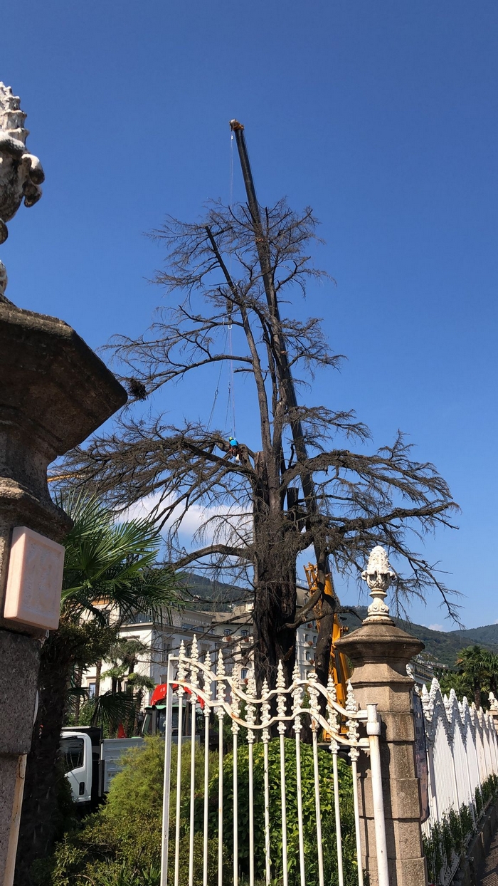 STRESA - 18-08-2022 -- Si sono concluse ieri le operazioni di rimozione del cedro dell’Himalaya di Villa Ducale, a Stresa. L’albero monumentale, dichiarato pericoloso dagli agronomi il mese scorso e oggetto di un’ordinanza di abbattimento del sindaco Marcella Severino per ragioni di incolumità pubblica, è stato tagliato ramo per ramo da una ditta specializzata, che poi ha ridotto il tronco. Ieri s’è lavorato alle radici.