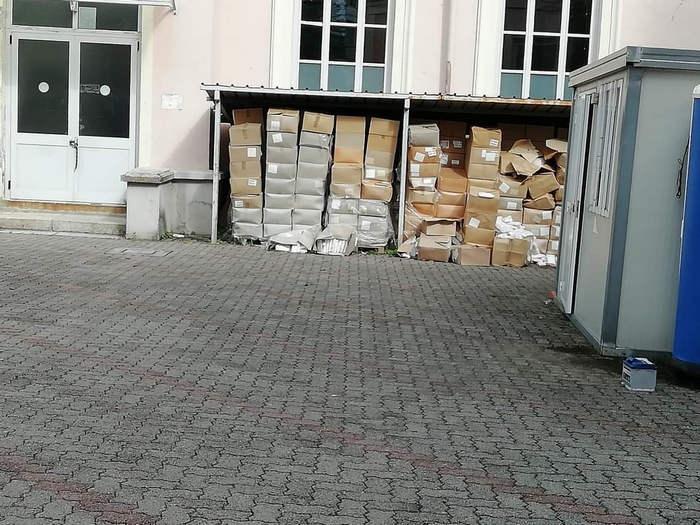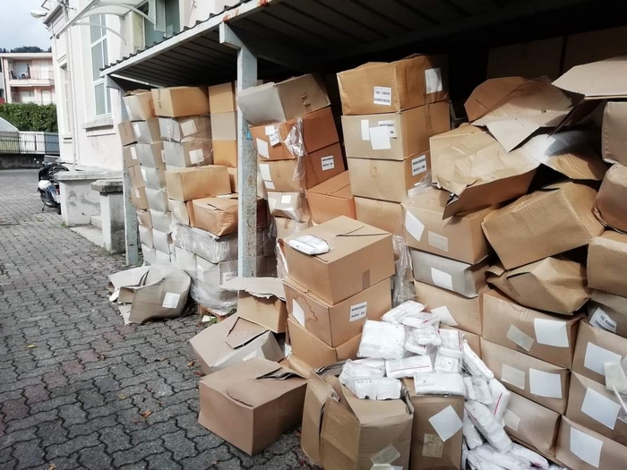 VERBANIA - 29-09-2022 -- Uno spreco. Le foto di cartoni e cartoni di mascherine ammonticchiati all’esterno del “Cobianchi” l’ha postata su Facebook un elettore verbanese che, domenica, s’è recato alle urne nel seggio allestito all’interno dell’istituto superiore. Nell’accedere all’aula adibita alle votazioni è passato dal cortile interno scoprendo che migliaia e migliaia di mascherine, ancora imballate, sono esposte agli elementi atmosferici, una parte ricoverata sotto una tettoia e un’altra nemmeno protetta. È pur vero che, fortunatamente, la pandemia è arretrata e in classe non è più necessario indossare la mascherina, ma è anche vero che non è obbligatorio lasciar deteriorare il materiale in eccesso.