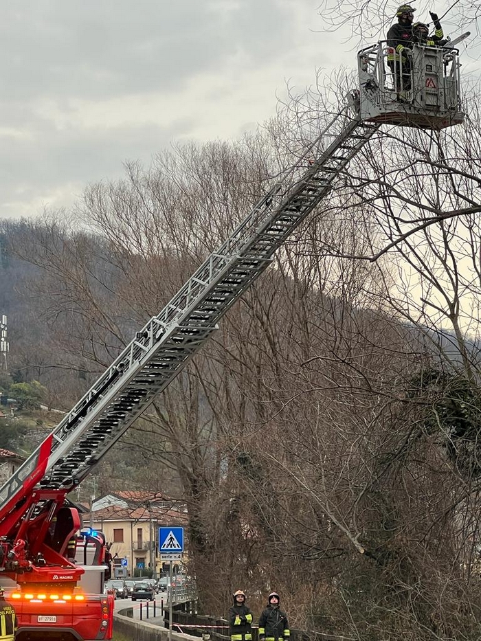 VERBANIA - 13-01-2023 -- I vigili del fuoco di Verbania sono intervenuti, questo pomeriggio a Fondotoce per i rami pericolanti incombenti sulla statale 34 del Lago Maggiore. Con un mezzo dotato di autoscala piazzato in metà carreggiata, mentre la polizia municipale regolava il traffico, i pompieri sono intervenuti per rimuovere i rami più ingombranti della folta vegetazione cresciuta sulla riva del canale che collega i laghi di Mergozzo e Maggiore.