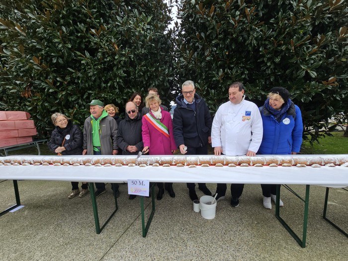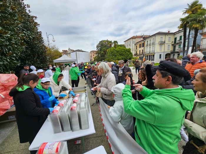 VERBANIA - 12-11-2023 -- Misura 52,50 metri il cannolo più lungo del mondo. A prepararlo, stamane sul lungolago di Pallanza in occasione di un evento con finalità benefico organizzato dall’associazione Gente del sud, è stato il pasticciere di origine siciliana -ma trapiantato a Omegna- Franco di Perna. Zio Ciccio, come viene chiamato, ha diretto il nutrito gruppo di volontari che ha assemblato in piazza Garibaldi il maxidolce che, protetto da gazebo -il meteo ha minacciato pioggia, rischiando di compromettere la prova- ha superato la misura richiesta, anche se sarebbe potuto essere ancora più grande, dal momento che era pronto materiale per raggiungere i 59 metri. Decisivo è stato, in questo senso, l’esaurimento dei tavoli a disposizione.