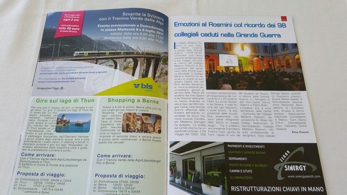 È In distribuzione da oggi l’ultimo numero di Idea, il mensile patinato freepress edito da Promossola e diffuso dal gruppo Vco24. I verbanesi hanno imparato a conoscerlo negli ultimi dodici mesi attraverso i distributori gratuiti di giornali collocati in diversi punti della città. A Intra (piazzale Flaim, piazza Mercato, lungolago, via San Vittore, piazza Ranzoni, via XXV Aprile), Pallanza (di fronte all’ospedale, piazza Gramsci, piazza Garibaldi), Suna (imbarcadero), Fondotoce (farmacia) e Trobaso (piazzetta di via Repubblica) – oltre alla cartolibreria Alberti – i lettori, che hanno decretato il successo dell’iniziativa e che ringraziamo per l’attenzione, hanno potuto prelevare una media mensile di 7-8.000 copie di una rivista distribuita anche in Ossola, in Canton Vallese e in Canton Ticino e che è bilingue italiano/tedesco. Nel numero di giugno spazio al Verbano con la bandiera Blu di Cannero e Cannobio e con le celebrazioni della patronale di San Vittore, oltre alla ricostruzione, a Arona, dell’arco di Palmira distrutto dall’Isis.