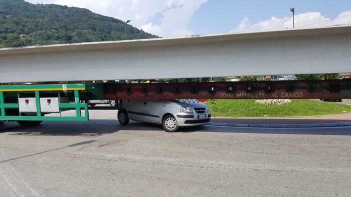 È senza gravi conseguenze ma dalla dinamica spettacolare l’incidente accaduto attorno alle 15 di oggi in corso Nazioni Unite. Proveniente da Fondotoce e diretto al vicino cantiere Lidl, un trasporto eccezionale di travi cementizie prefabbricate regolarmente scortato dai mezzi di assistenza è entrato nella rotonda di fronte alla questura, quella all’angolo con via Zara e il bivio per l’ospedale “Castelli”. La motrice era quasi oltre il rondò, ma il posteriore ancora sulla carreggiata del rettilineo nell’attimo in cui la Hyunday Matiz di colore grigio condotta da un 78enne è andata a sbattere contro il pianale dell’autoarticolato. L’impatto è avvenuto a metà parabrezza e ha immediatamente arrestato il veicolo. L’anziano a fianco del conducente è stato soccorso dal 118 e portato nel vicino nosocomio “Castelli” per accertamenti ma senza apparenti lesioni. Sul posto, per i rilievi, la Polstrada, i cui agenti non hanno dovuto far altro che uscire dall’ufficio e attraversare la strada. Il traffico è stato regolato dal personale al seguito del trasporto eccezionale. Lunghe code si sono registrate sulla statale 34.