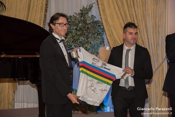 Sport, musica e solidarietà hanno contraddistinto l’evento presentato da Maria Elisa Gualandris e Piero Pratesi che ha avuto tra gli ospiti il giornalista-gourmet Edoardo Raspelli; l’ex ciclista azzurro Luca Paolini; il pianista Alessandro Oliveri; i fratelli Clod & Andrew Attampato, che portano il sorriso ai bimbi malati di tumore ricoverati in ospedale; la grafologa Candida Livatino; imprenditori e manager del mondo della televisione tra cui Massimo Ciampa, segretario generale della Fondazione Mediafriends di Mediaset. Paolini ha portato in dono la maglia iridata -l’ultima italiana- conquistata nel 2008 a Varese da Alessandro Ballan con la firma di altri ciclisti azzurri saliti sul tetto del mondo; e la casacca del team di cui è ds il varesino Ivan Basso, anch’egli campione iridato. Entrambi i cimeli sono stati assegnati a estrazione al pubblico. La serata è vissuta di numerosi premi, attestati e riconoscimenti, ma anche della donazione alle scuole materne di Suna, alle elementari di Crevoladossola e a quelle di Villadossola, all’AffDown Vco e al Gsh Sempione ‘82. Sorprendente, intenso ed emozionante il “blitz” della Fanfara Bersaglieri Valdossola. Gli ex bersaglieri hanno fatto irruzione nella sala del Grand’hotel liberando tutta la potenza dei loro strumenti a fiato e tenendo un improvvisato mini-concerto concluso con l’inno di Mameli e gli ospiti in piedi a cantare Fratelli d’Italia. La musica è stata il filo conduttore dell’evento, ribattezzato “Ricomincio da 20”, il titolo dell’ultimo album del “Cantante della solidarietà” (prodotto da Francesco Sottili con Mariarosaria Della Martora) e del progetto benefico delle carrozzine legato al ventennale dell’attività e che ha finora permesso di donarne 150 in tutta Italia.