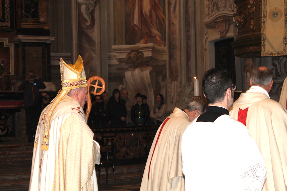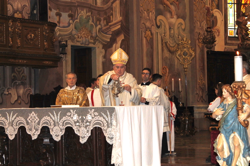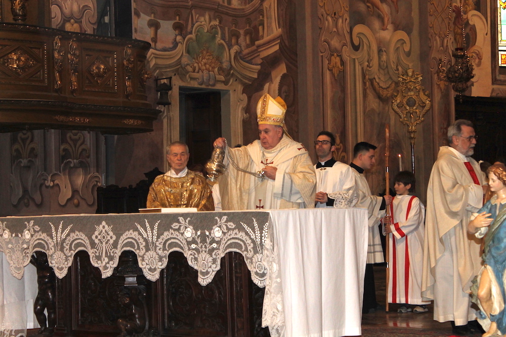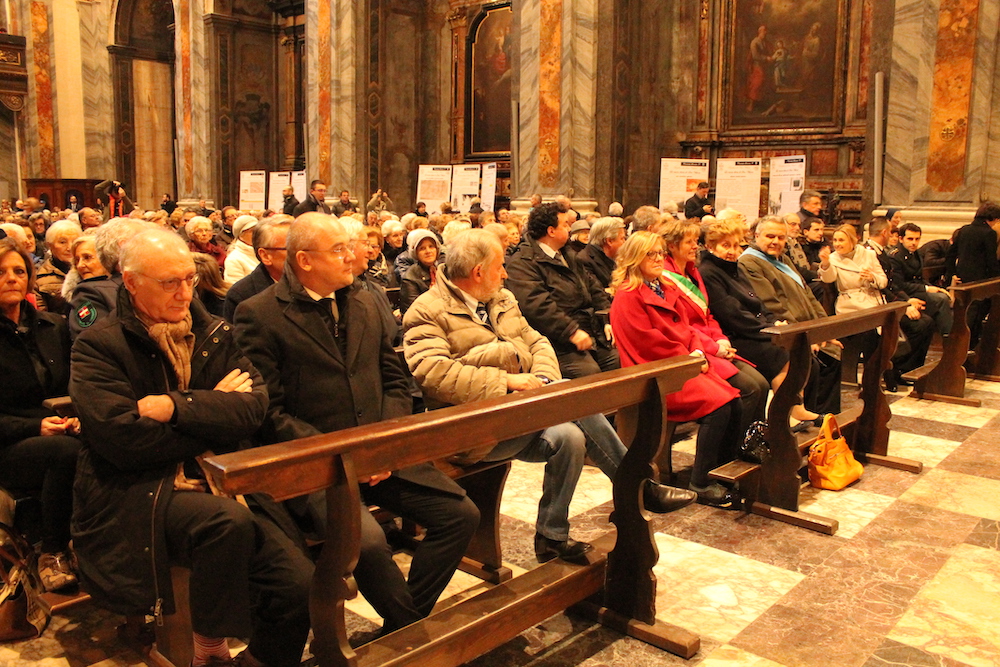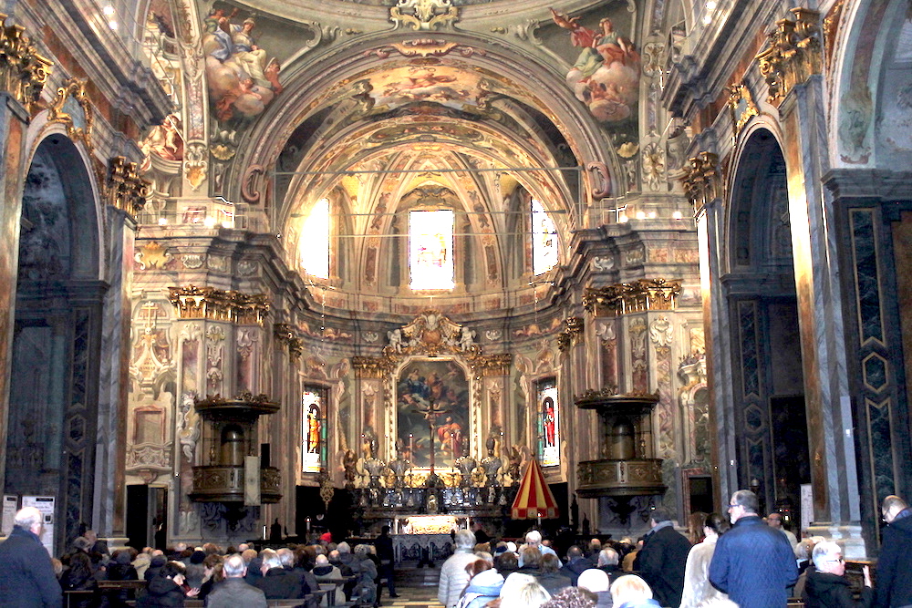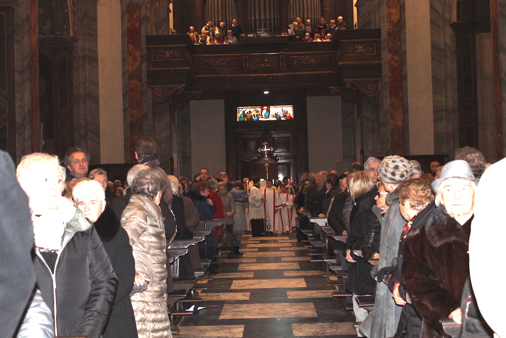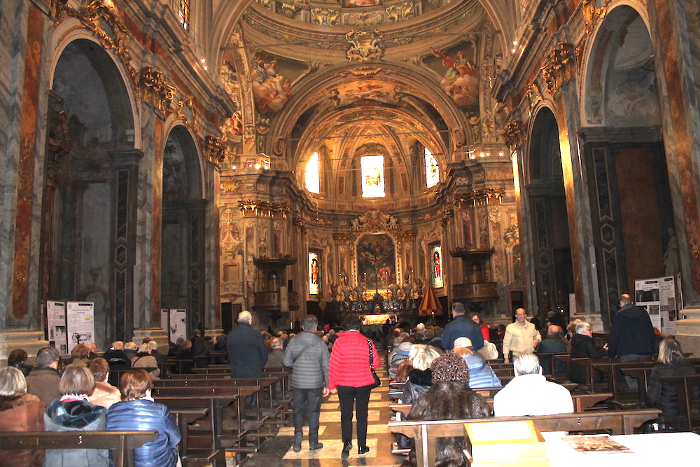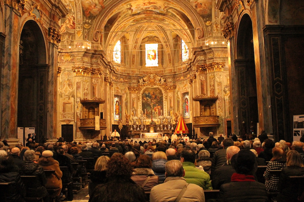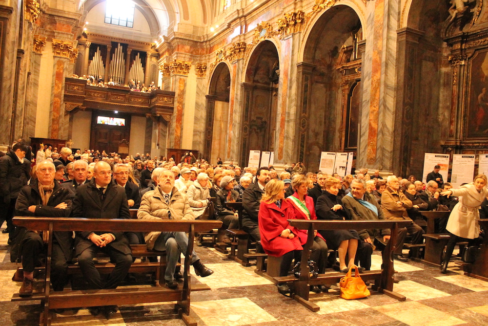il Paradiso era un racconto a colori, fatto di cieli azzurri, angeli dalle gote rosa e santi e profeti dalle vesti variopinte. Come il patrono Vittore, il cui martirio nel XVIII secolo il pittore lombardo Francesco Maria Bianchi rese con raffinata maestria negli affreschi del timpano e dell'abside della basilica madre del Verbano. Sono occorsi 4 anni di lavori e un milione e mezzo di euro per restituire la luce e i suoi colori a San Vittore, ne serviranno più o meno altrettanti per completare l'opera sistemando gli esterni e ripulendo le otto cappelle laterali. Sono annerite dai secoli di sporco e fuliggine depositate sui fregi e le pitture. Ma stasera, sapientemente illuminata con un nuovo impianto, la basilica s'è già mostrata in tutta la sua imponenza ai tanti cittadini e alle autorità che hanno preso parte alla messa d'inaugurazione dei restauri celebrata da Franco Giulio Brambilla. Il vescovo ha rimarcato quanto l'arte rappresenti un valore per la comunità, al pari di quello spirito solidale che ha colto ed evidenziato nell'altra inaugurazione della giornata, quella dell'emporio dei legami, sempre a Intra.