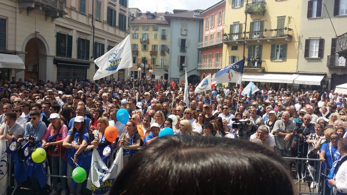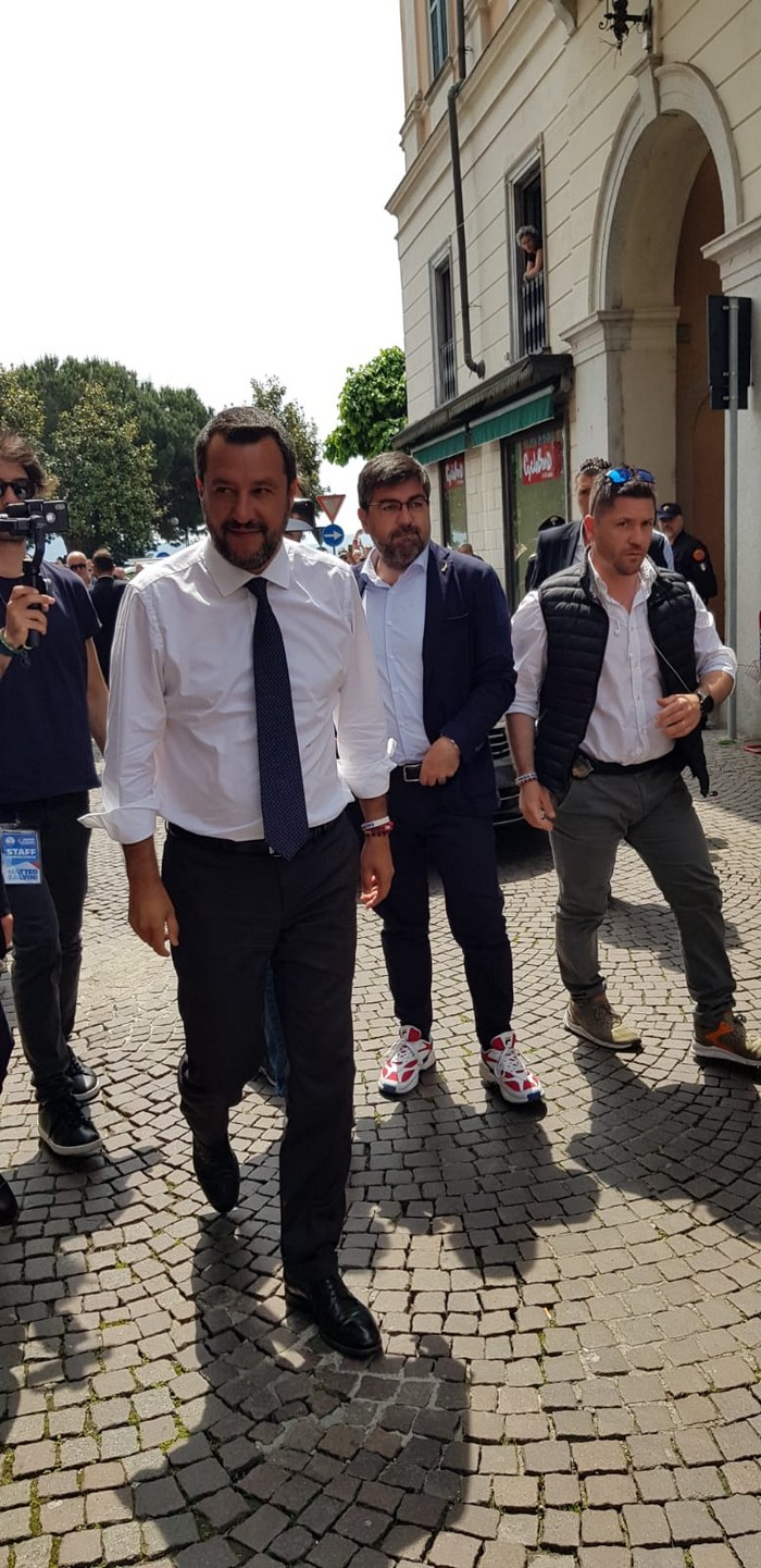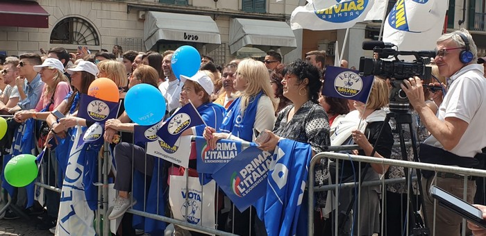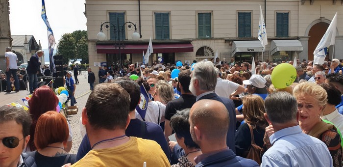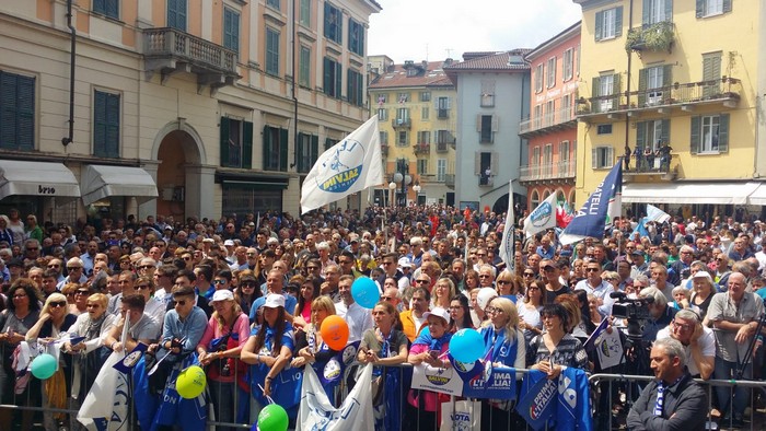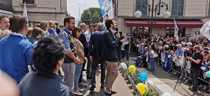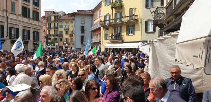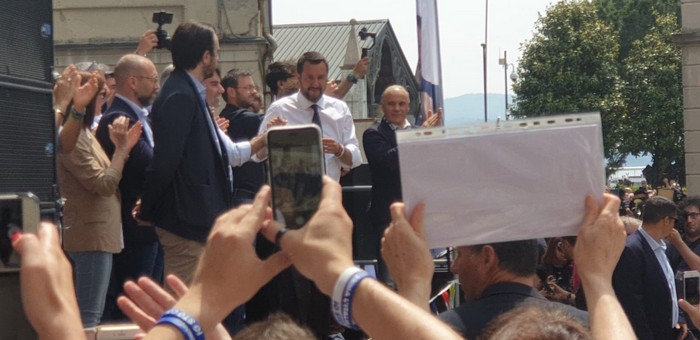 un comizio di poco più di mezzora che non ha tradito però l’attesa del popolo della Lega e dei fan di Matteo Salvini, che hanno atteso un po’ oltre mezzogiorno che il loro leader arrivasse a Verbania. Le frasi ad effetto sull’Europa da rifare e le tasse da ridurre, la rivendicazione dell’azione del governo su immigrazione e pensioni… il leader del Carroccio oggi in piazza Ranzoni a Intra ha battuto sui temi a lui cari, concentrando il comizio che ha chiuso la campagna elettorale della Lega nel Vco sulle questioni generali, legate più all’Europa (sul palco c’era il candidato a Strasburgo Alessando Panza, che è ossolano) che ai temi locali delle Regionali e delle Comunali. Naturalmente, al suo fianco, c’erano il capogruppo alla Camera e coordinatore piemontese Riccardo Molinari, il senatore Enrico Montani, il commissario Riccardo Perugini che hanno accompagnato il candidato alla Regione Alberto Preioni, gli aspiranti sindaci di Gravellona Toce e Verbania, Paolo Nocilla e Giandomenico Albertella, quest’ultimo circondato da numerosi candidati della sua lista. Altri erano tra il pubblico, in una piazza piena per metà che ha accolto circa 800 persone e che era gremita nel primo terzo, quello al di sotto del palco –collocato davanti al negozio Colombara– , dove tra bandiere, sciarpe e gadget si respirava quel clima di partecipazione, appartenenza e tifo che accompagna, nella frangia dei fedelissimi, le uscite pubbliche del “capitano” e che, alla fine, s’è messa in coda per gli immancabili selfie. Ingente lo spiegamento delle forze dell’ordine, che non hanno dovuto faticare a limitare il centinaio di contestatori venuti in piazza e mantenuti a distanza.