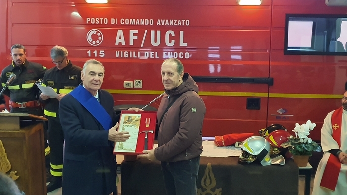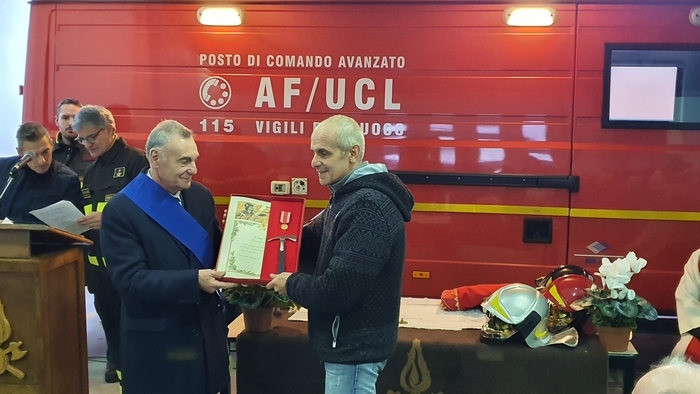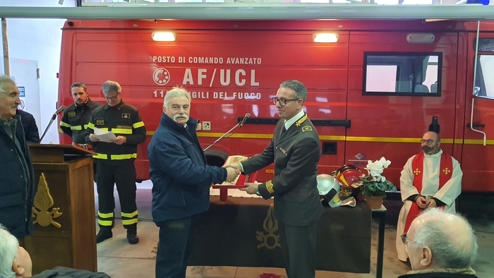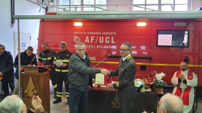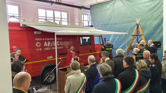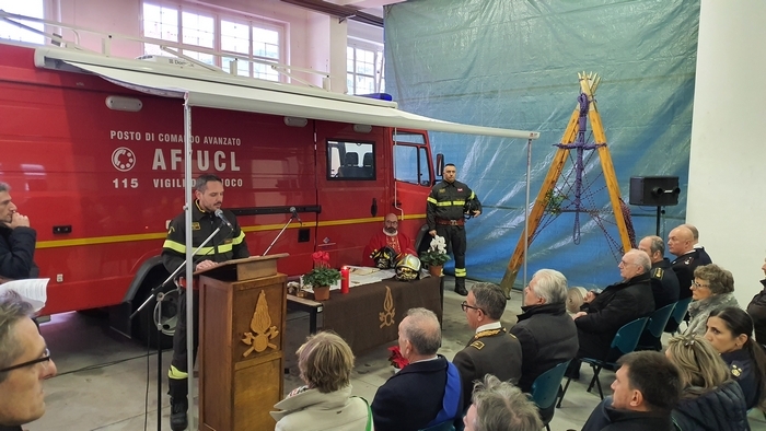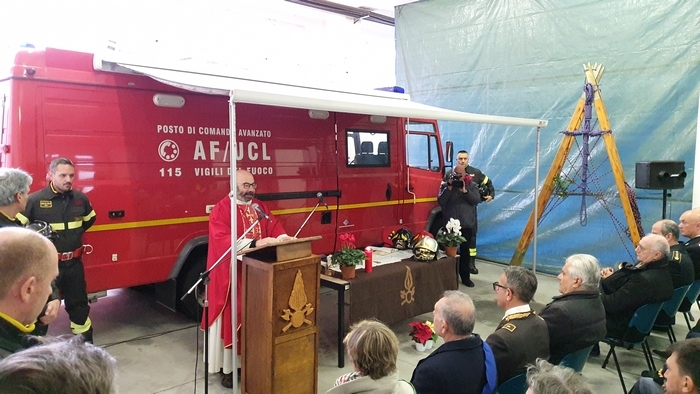 ed esibizione/esercitazione. Tra i rappresentanti delle istituzioni e tra la gente comune (era presente anche una classe della scuola materna Tozzi di Suna), stamane i vigili del fuoco del Vco hanno festeggiato la loro patrona Santa Barbara. Il comando, come accade ogni anno, ha aperto le porte alla cittadinanza -radunata per l’alzabandiera con inno di Mameli al pennone di ingresso-, mettendo in mostra i mezzi di soccorso e adibendo il deposito a chiesa. È sotto una croce fatta di corde intrecciate sorrette da una scala e davanti all’improvvisato altare della stazione mobile di comando che don Giovanni Antoniazzi, parroco di Madonna di Campagna e cappellano dei pompieri (funzione ricevuta in eredità dal suo predecessore don Egidio Borella ed esercitata per la prima volta oggi), ha celebrato la messa in onore di santa Barbara. A seguire il discorso del comandante Felice Iracà e la premiazione dei pompieri che si sono meritati nel 2019 le ricompense. I diplomi delle croci di anzianità sono state consegnate ad Adam Williams Meloni (coordinatore), Marco Candiotti, Lorenzo Giavina, Simone Crivelli, Andrea Mantoan, Marco Sacchi, Riccardo Sacchi, Gabriele Sarli e Marta Valeria Sessa (volontari). I diplomi di lodevole servizio sono andati ai caporeparto esperti Giorgio Ghidella, Eutizio Sevi, Fernando Spinozzi, Gabriele Guilizzoni; ai caposquadra volontari Giorgio Lucchini, Tullio Domenici, Valter Ottina, Giovanni Viola, Francesco Bionda e Fulvio Manoni.