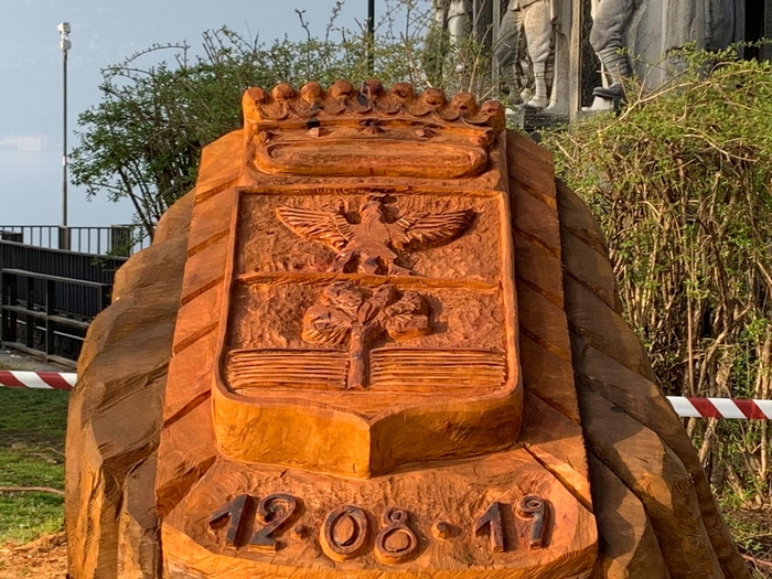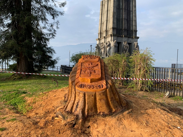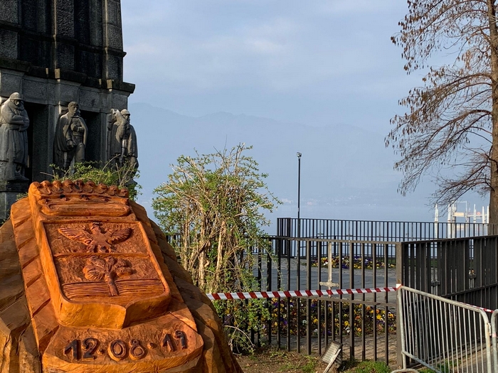 lo scorso 12 agosto dalla tempesta (il cosiddetto downburst) che tanti danni ha fatto sul Verbano e, in particolare, nel golfo Borromeo, non resta quasi più nulla. L’albero s’è schiantato a terra e la sua chioma è stata rimossa. Avrebbe dovuto esserlo anche il ceppo superstite, se non che il comune di Verbania ha deciso, con l’intenzione di trasformare un evento negativo in un’opportunità, di farne una scultura. L’artista di Armeno Marco Vecchi ha scolpito e cesellato il logo della città che, trattato, ora è parte integrante del lungolago di Pallanza.