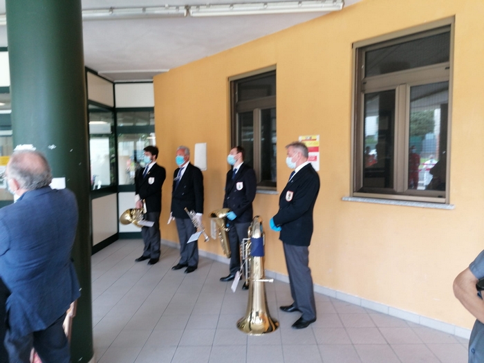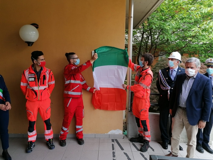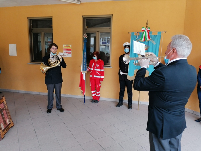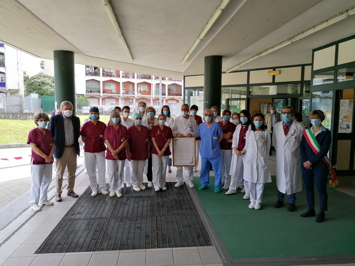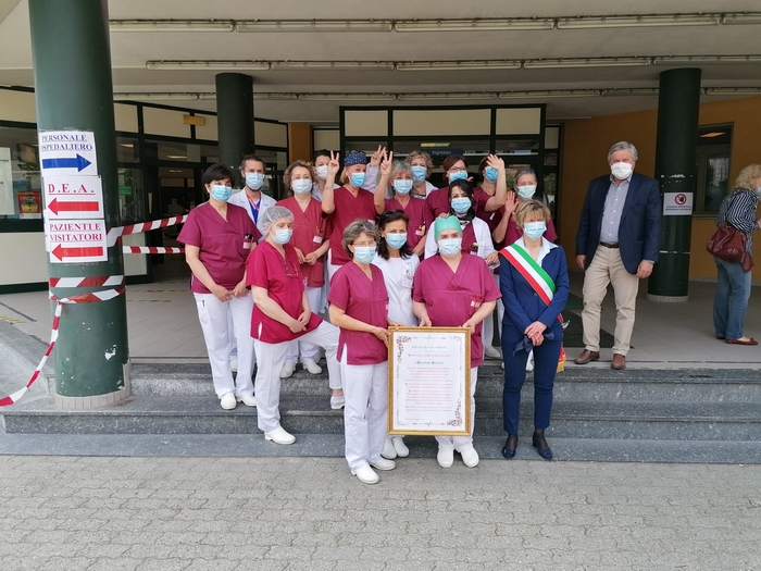 ringraziano tutti coloro che hanno lavorato all’ospedale Castelli con professionalità e umanità per combattere il covid 19”. È scritto su una targa, affissa sul muro a destra dell’ingresso dell’ospedale “Castelli”, il messaggio che il Consiglio comunale di Verbania ha scelto nel conferire la benemerenza 2020 agli operatori sanitari del nosocomio cittadino. Oggi, giorno di San Vittore patrono, il presidente dell’assemblea Giandomenico Albertella e il sindaco Silvia Marchionini hanno presenziato alla cerimonia tenutasi all’aperto, per rispondere alle norme che limitano gli assembramenti (anche se il numero di persone che s’è radunato era di circa una trentina). Hanno consegnato la pergamena con le motivazioni della benemerenza a Vincenzo Mondino, primario del reparto di Malattie infettive. Per l’Asl è intervenuto anche Francesco Garufi, direttore sanitario degli ospedali, e Liliana Maglitto, dirigente delle Professioni sanitarie. Di fronte a tanti rappresentanti del personale -medici e infermieri- e del mondo del volontariato (Croce Rossa, Croce Verde e Squadra nautica di salvamento) lo scoprimento della targa s’è accompagnato alle note della tromba di Paolo Milesi e di tre fiati dell’Ente musicale Città di Verbania.