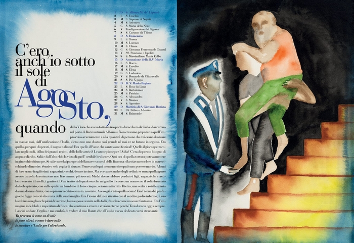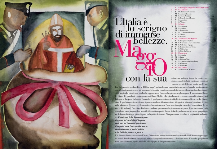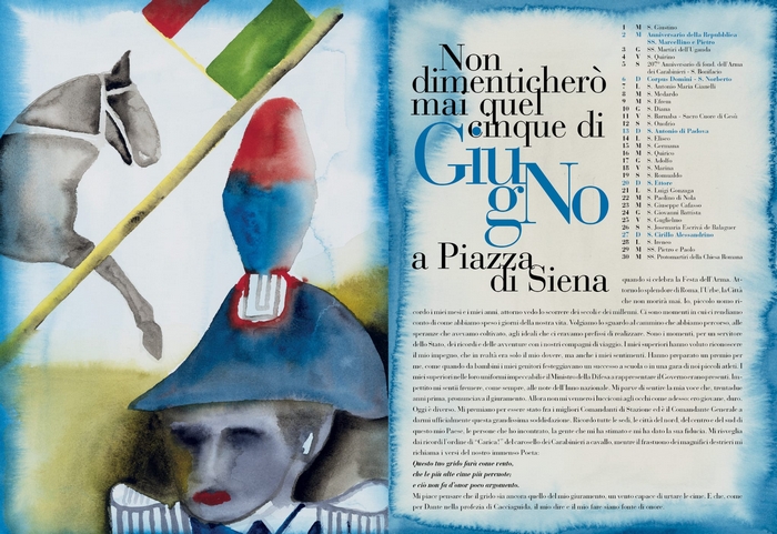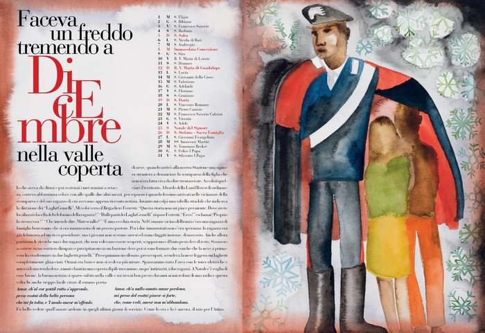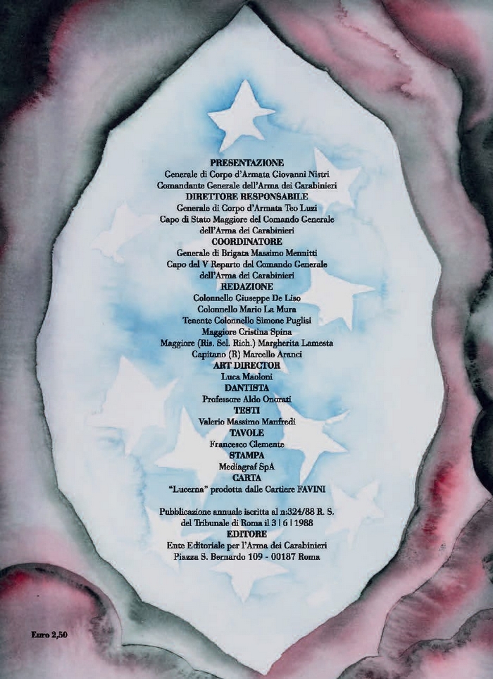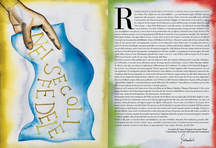 del quale nel 2021 corre il 700° anniversario della morte, il calendario storico dell’Arma dei carabinieri. Presentato oggi (naturalmente in forma virtuale, date le contingenze dell’epidemia di Covid-19) anche dal comando provinciale del Vco, è opera del professor Aldo Onorati, noto dantista; dello scrittore Valerio Massimo Manfredi; e con il tratto grafico di Francesco Clemente, artista della transavanguardia italiana, che ha curato le tavole. Il maresciallo Donato Alighieri, assurto a simbolo del buon carabiniere, fa da guida tra le dodici storie che accompagnano ciascun mese dell’anno. Racconti di vicende verosimili, ispirate a fatti veri, senza tempo, che nella forma richiamano la prosa del Sommo poeta e che trasmettono gli ideali dell’Arma.
