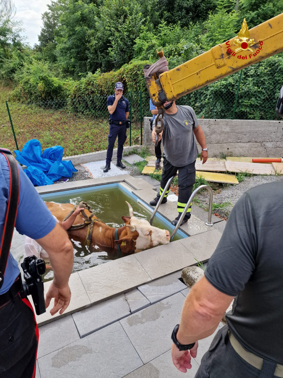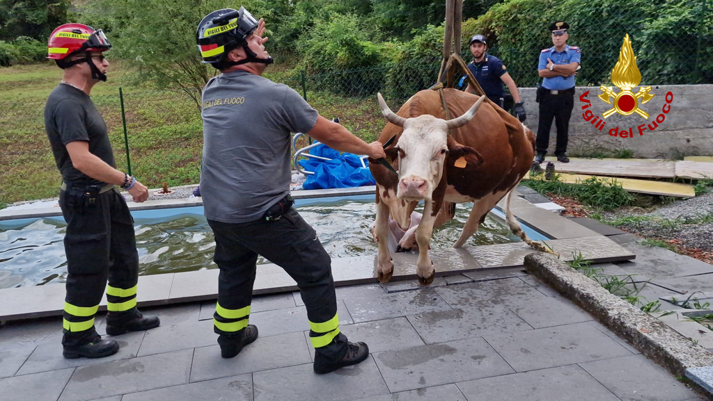 PORTO V. - 28-07-2022 -- C’è una mucca in piscina. È questo il messaggio che ha raggiunto stamane la centrale operativa dei vigili del fuoco di Varese. A Porto Valtravaglia, sulla sponda lombarda del Verbano, in una vasca d’una proprietà privata, è finito -chissà se perché in cerca di refrigerio- un bovino per recuperare il quale è stato necessario l’intervento d’una gru che ha sollevato l’animale, nel frattempo imbragato, dall’acqua riportandolo sulla terraferma.