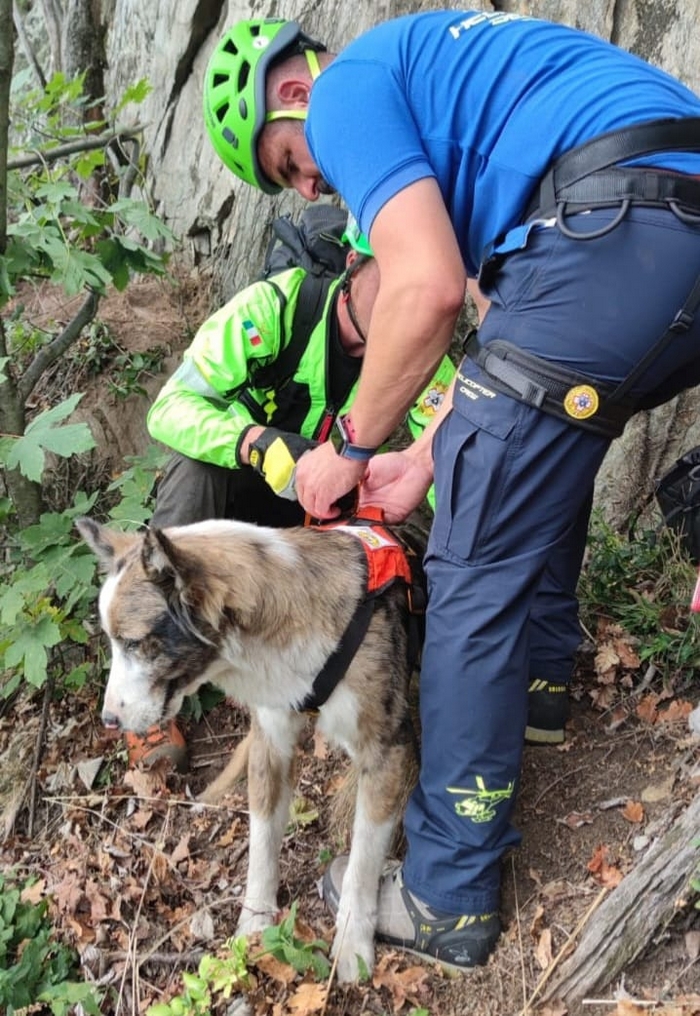 COSSOGNO - 14-09-2022 -- Otto sta bene e scodinzola felice coi suoi padroni, ai quali l’ha restituito il Soccorso alpino. Sono stati loro, i volontari della stazione Valgrande, a trarre in salvo stamane un cane che, caduto in un dirupo nella frazione Ungiasca di Cossogno (al confine con Miazzina) era rimasto bloccato su una cengia. A chiamare il numero di emergenza è stato il sindaco, informato della situazione. Sul posto è giunta una squadra che, calandosi dal pendio, ha imbragato il cane e l’ha condotto a valle dai padroni, che lo attendevano.