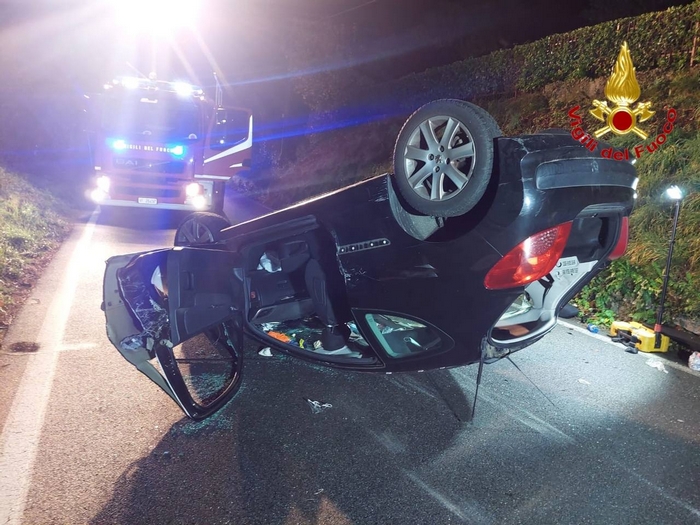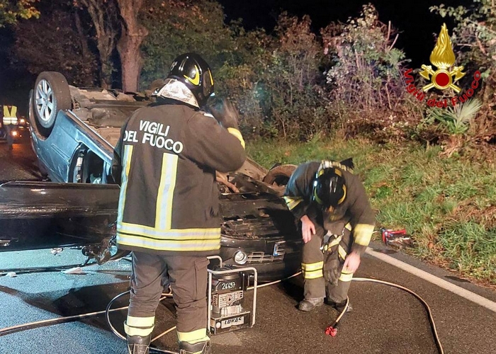 CASTELVECCANA - 17-11-2022 -- Tre donne con lesioni lievi è il bilancio dell'incidente stradale avvenuta la scorsa notte a Castelveccana. Lungo la strada provinciale 69 due veicoli si sono urtati da loro per cause in via di accertamento. Uno s’è ribaltato, finendo cappottato in mezzo alla carreggiata. A bordo vi erano due ragazze di 19 anni e una donna di 79. Una di esse, prima di essere affidata ai sanitari del 118, è stata estratta dall’abitacolo dai vigtili del fuoco, intervenuti con un’autopompa dalla sede di Luino.