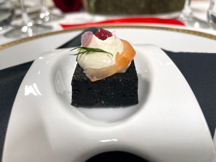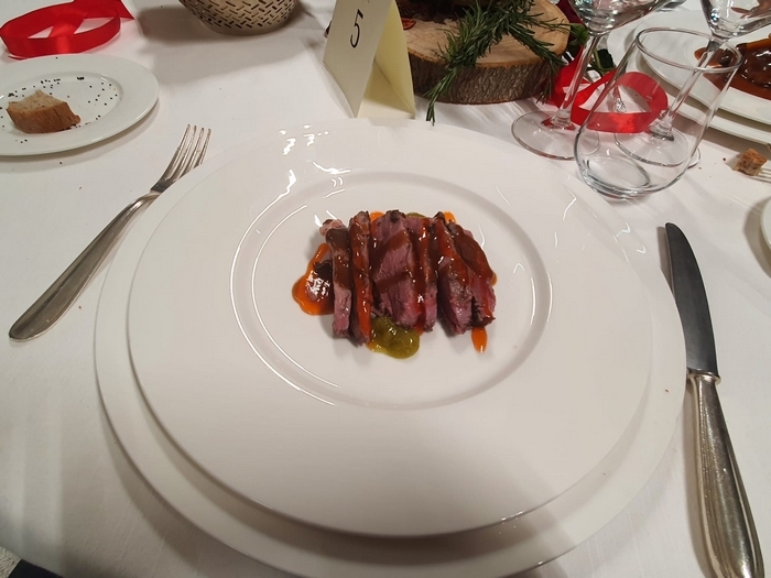 Il menù comprende antipasto, primo, secondo e dolce con la possibilità di scegliere tra tre piatti per ciascuna portata. Al debutto l’offerta degli antipasti era tra autunno vegetale, vitello tonnato 2022, la trota nel bosco. Per i primi si potevano degustare bottoni di faraona in ricordo di un bollito misto; riso falasco con gorgonzola e pere, riduzione di Nebbiolo; gnocchi di castagne e zucca con aria di rosmarino. Cappello del prete brasato, burger di lenticchie e barbabietole e petto d’anatra laccato all’Aperol e marmellata ai pomodori verdi erano i tre secondi proposti, seguiti da sfera di cioccolato bianco con inserto alle prugne e crumble con zafferano, castagnaccio con gelato al grana padano e cannolo con “ricotta” alle mandorle, pere caramellate come dolce.