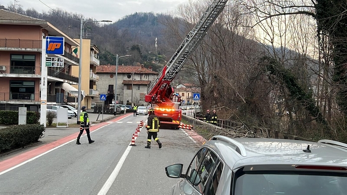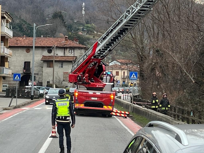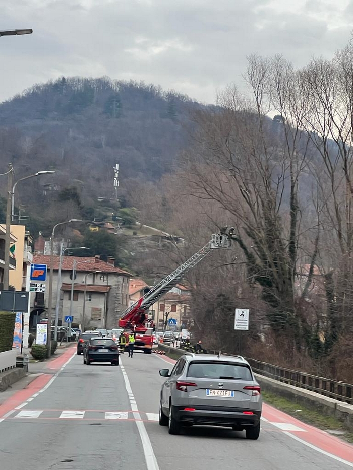 VERBANIA - 13-01-2023 -- I vigili del fuoco di Verbania sono intervenuti, questo pomeriggio a Fondotoce per i rami pericolanti incombenti sulla statale 34 del Lago Maggiore. Con un mezzo dotato di autoscala piazzato in metà carreggiata, mentre la polizia municipale regolava il traffico, i pompieri sono intervenuti per rimuovere i rami più ingombranti della folta vegetazione cresciuta sulla riva del canale che collega i laghi di Mergozzo e Maggiore.