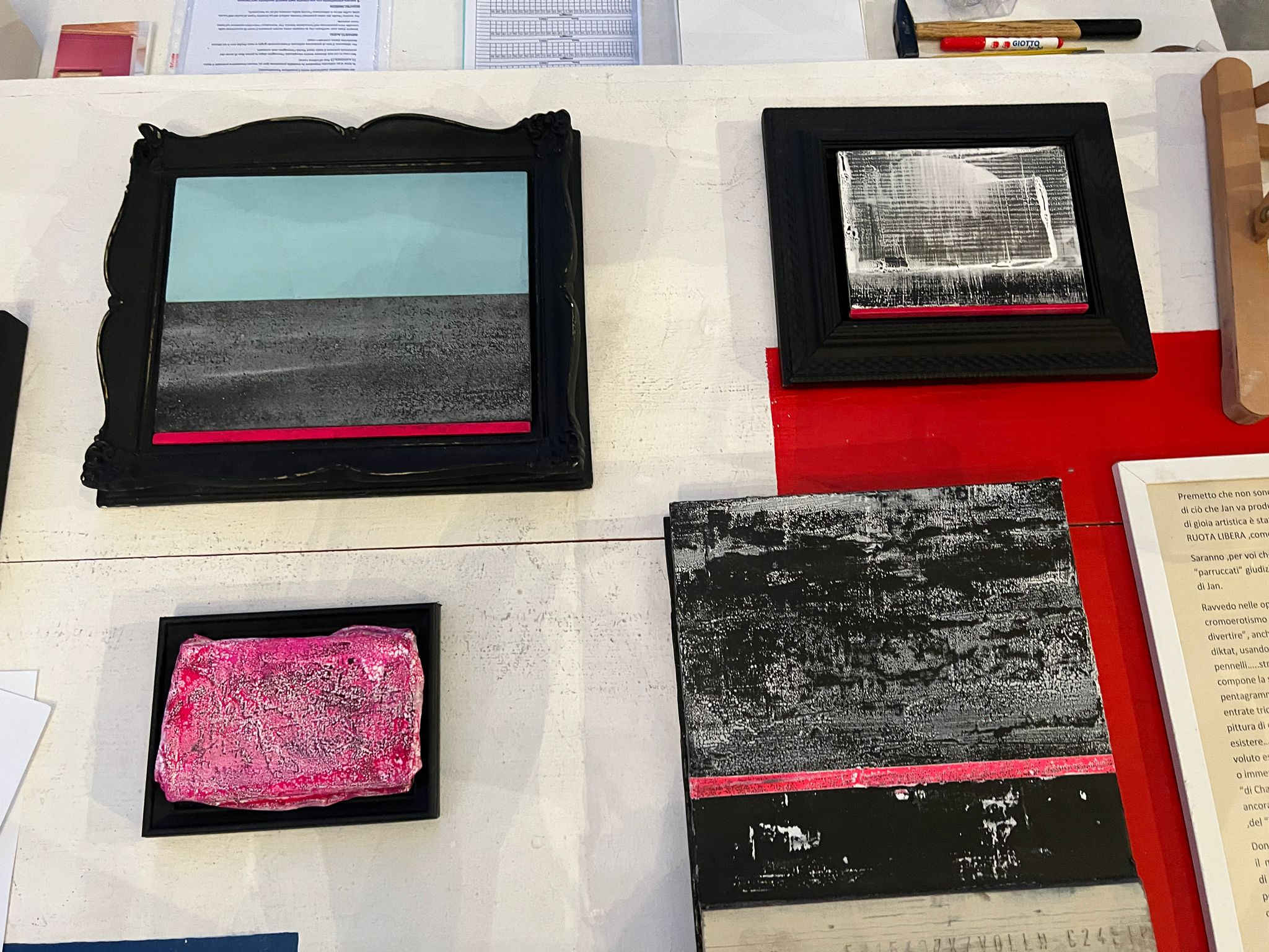 Ecco quindi trovare spazio, uno accanto all'altro, i periodi delle Kromie, un astratto caratterizzato dal togliere il superfluo e arrivare all'essenziale passando per le opere di Homo contemporaneo, con la grafica di volti femminili e maschili appuntati (o forse sfregiati?) con tratti secchi, fino ad arrivare al periodo Kinesis, caratterizzato dallo slancio.