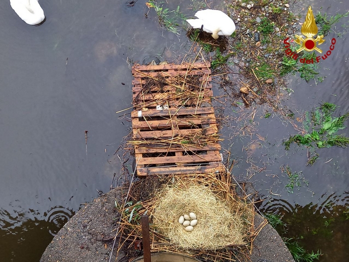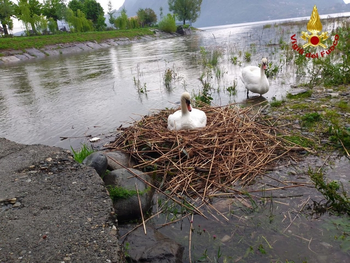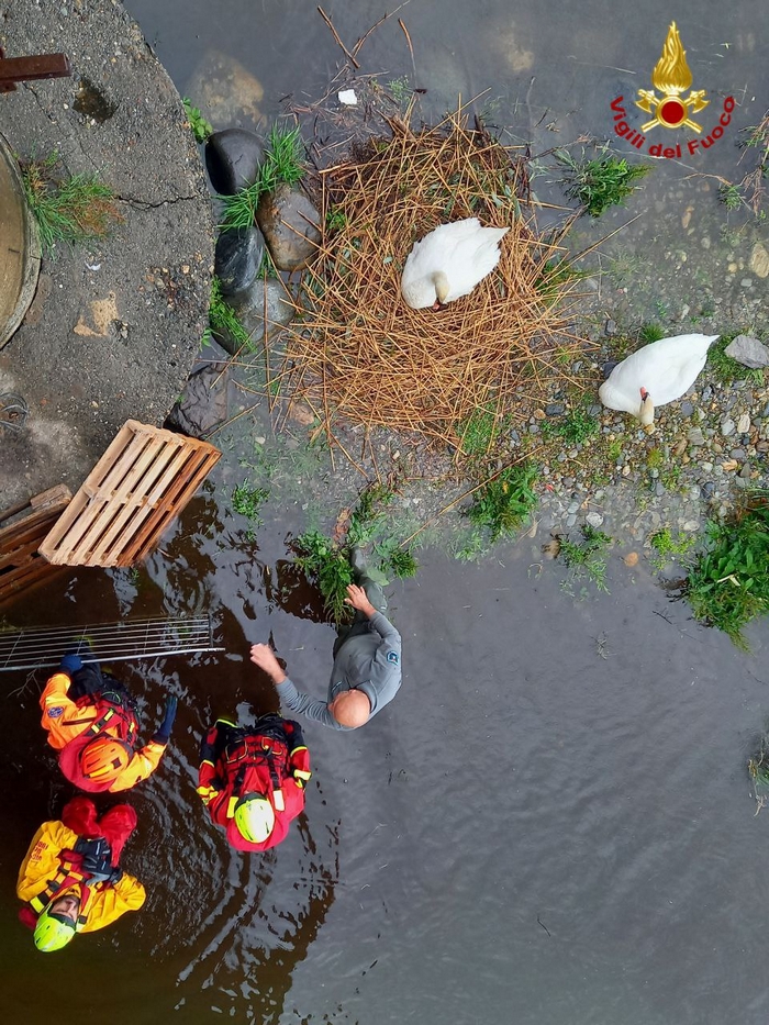 VERBANIA - 01-05-2023 -- Le precipitazioni che nelle ultime ore hanno toccato il Verbano, ingrossando i corsi d’acqua in secca, hanno sorpreso una coppia di cigni che, in questo periodo di siccità, aveva nidificato alla foce del torrente San Giovanni, appena al di sotto del Cavallotti. In condizioni normali il nido sarebbe stato al sicuro ma, con l’alzarsi del livello del torrente, è stato necessario spostarlo. La polizia provinciale ha allertato i vigili del fuoco che, oggi pomeriggio, hanno raggiungo il fiume, trasferendo sul pilone del ponte, ben al di sopra del pelo dell’acqua, il nido contenente sei uova prossime a schiudersi, collegandolo con il greto attraverso due pallet.