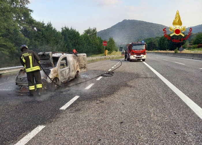 BROVELLO C. - 28-06-2023 -- L’autista s’è accorto che qualcosa non andava, ha accostato e, insieme al passeggero, è sceso dell’abitacolo guardando il mezzo che andava in fiamme. Non ci sono feriti nell’incendio che s’è verificato alle 20 di oggi sull’A26, in direzione nord. In un tratto dell’Autolaghi a ridosso dello svincolo di Brovello Carpugnino, un furgone è stato completamente distrutto. A domare l’incendio sono stati i vigili del fuoco del comando provinciale di Verbania, coadiuvati dai colleghi di Arona. Sul posto anche la Polstrada.