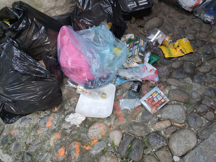 GHIFFA - 11-08-2023 -- Protestano, a Ghiffa, i residenti di via ai Motti, viottolo pedonale che si trova appena al di sopra del centro storico, tra il parcheggio del residence ex Panizza e la chiesa di Santa Croce. In una zona che gli operatori di ConSerVco non possono raggiungere con mezzi motorizzati, da qualche giorno si trovano a terra sacchetti di rifiuti indifferenziati vari, abbandonati.