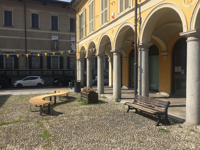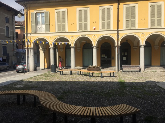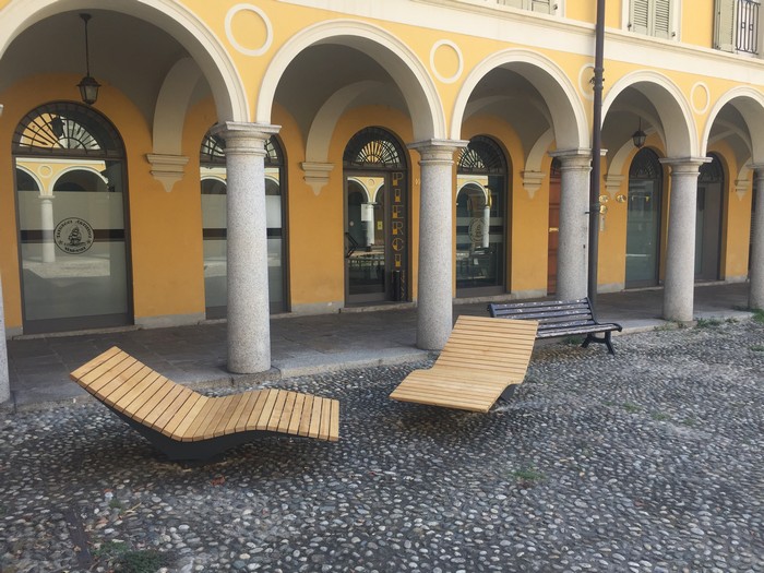 Un gruppo è stato posto a semicerchio attorno all’elemento centrale -un tempo fontana- della piazza, due a “esse” stanno ai lati, verso via Manzoni, mentre due ampie chaise-longue si trovano in disparte.