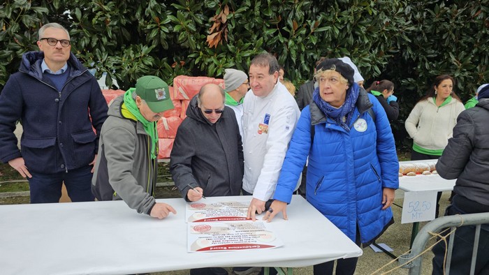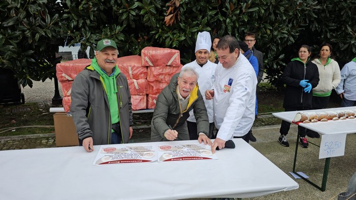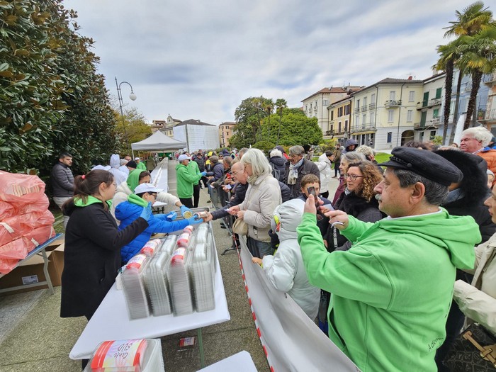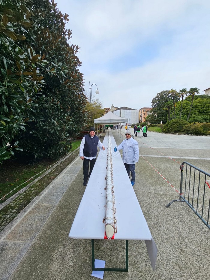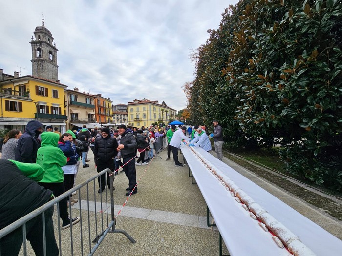 VERBANIA - 12-11-2023 -- Misura 52,50 metri il cannolo più lungo del mondo. A prepararlo, stamane sul lungolago di Pallanza in occasione di un evento con finalità benefico organizzato dall’associazione Gente del sud, è stato il pasticciere di origine siciliana -ma trapiantato a Omegna- Franco di Perna. Zio Ciccio, come viene chiamato, ha diretto il nutrito gruppo di volontari che ha assemblato in piazza Garibaldi il maxidolce che, protetto da gazebo -il meteo ha minacciato pioggia, rischiando di compromettere la prova- ha superato la misura richiesta, anche se sarebbe potuto essere ancora più grande, dal momento che era pronto materiale per raggiungere i 59 metri. Decisivo è stato, in questo senso, l’esaurimento dei tavoli a disposizione.