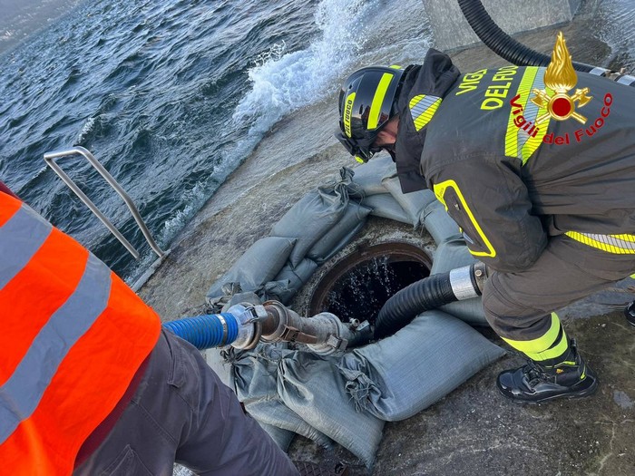 PORTO V. - 25-11-2023 -- Il tempestivo intervento dei vigili del fuoco, che con diverse motopompe hanno svuotato le casse di galleggiamento, ha permesso di "salvare" la struttura portuale di Porto Valtravaglia, sulla sponda lombarda del Lago Maggiore. Nella giornata di oggi i soccorritori sono stati allertati perché i pontili galleggianti stavano sprofondando verso il fondale per via dell'acqua entrata -per motivi ancora da chiarire- nelle casse, fungendo da zavorra anziché da galleggiante.