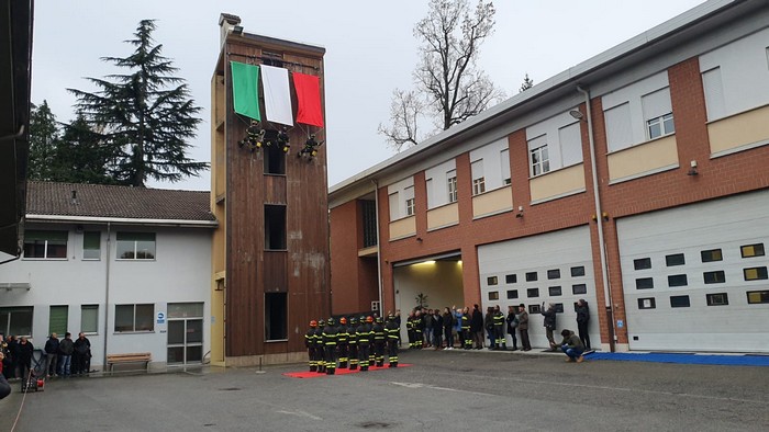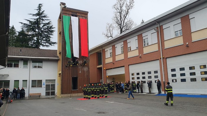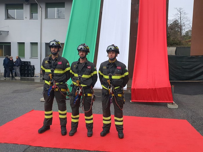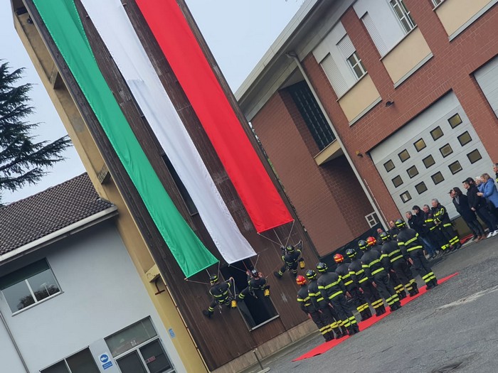 VERBANIA - 05-12-2023 -- L'inno di Mameli che suona mentre tre vigili del fuoco si calano dal castello di manovra, srotolando il Tricolore. È questa l'immagine dei festeggiamenti di Santa Barbara patrona, celebrati ieri al comando provinciale di Verbania.