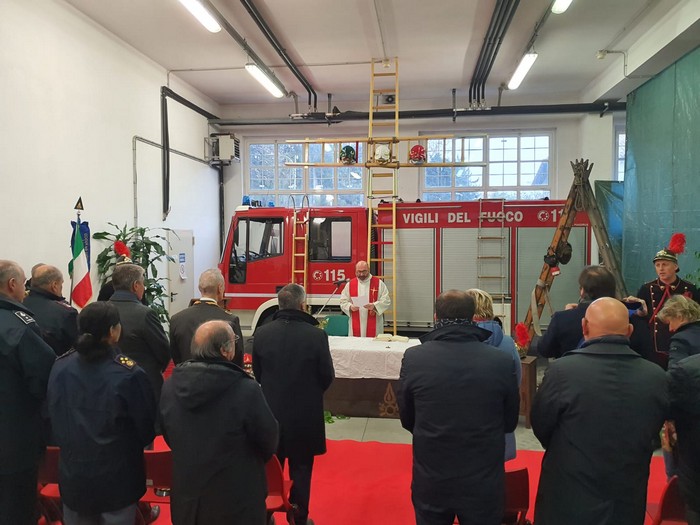 Il comandante Michele Castore ha fatto da padrone di casa, ospitando le autorità alla messa celebrata nel deposito mezzi -adibito a cappella- dal parroco di Madonna di Campagna, don Giovanni Antoniazzi.