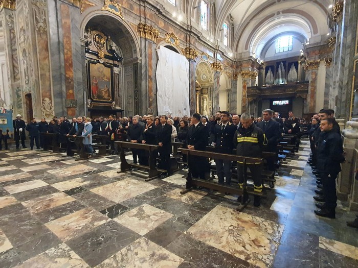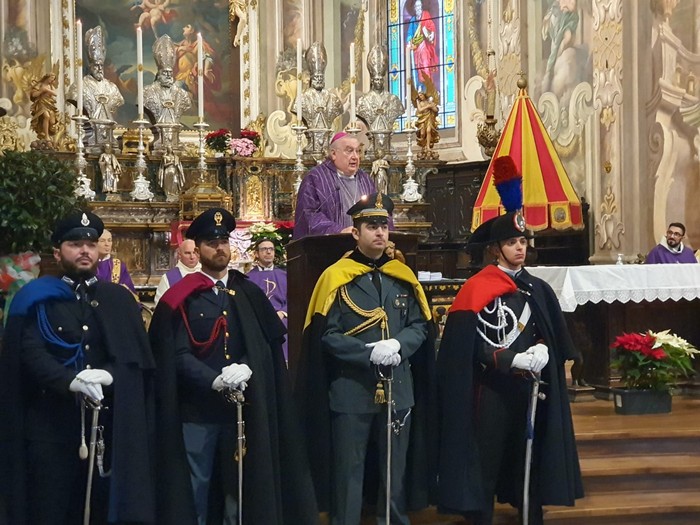 VERBANIA - 20-12-2023 -- C’erano anche i bambini delle vicine elementari rosminiane al precetto natalizio delle forze dell’ordine che, stamane, ha riempito la basilica di San Vittore. Guardia di finanza, carabinieri, polizia di Stato, polizia penitenziaria, vigili del fuoco e polizia locale erano presenti in massa -insieme alle associazioni combattentistiche e d’arma- alla cerimonia presieduta dal vescovo Franco Giulio Brambilla. Un anticipo di Natale che il vescovo ha legato all’ottocentesimo anno di vita del presepe, che realizzò per la prima volta San Francesco nel 1223. Il prefetto Michele Formiglio ha rivolto un saluto e un augurio, sottolineando l’importanza delle forze dell’ordine.