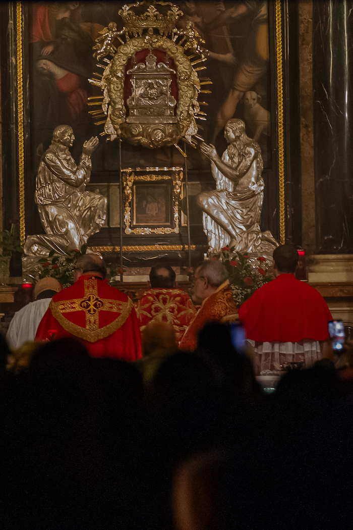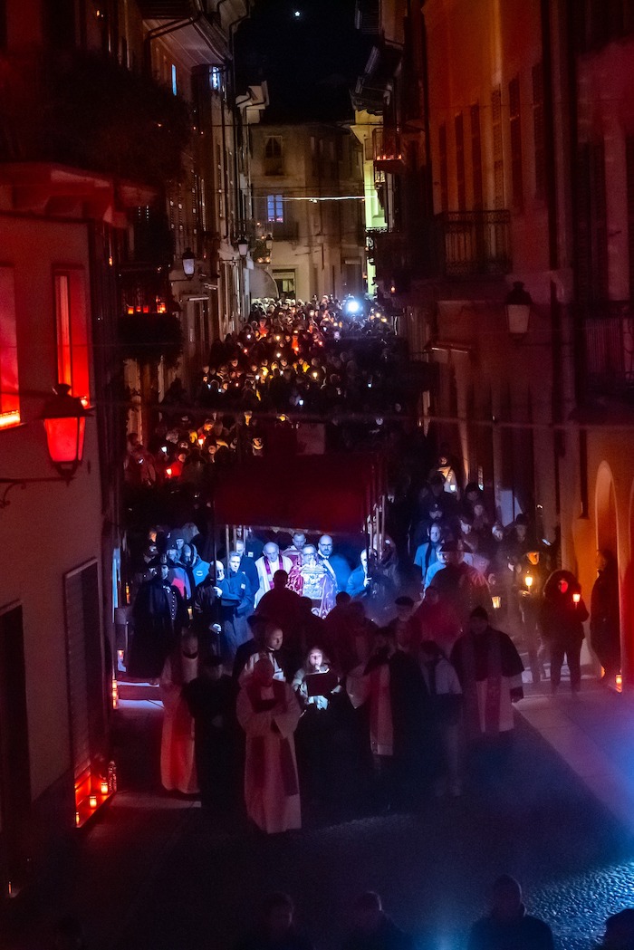 Al termine della messa, la reliquia è stata calata per il tradizionale bacio dei fedeli e portata in processione verso il santuario, dove rimarrà fino al pomeriggio odierno. La celebrazione proseguirà oggi alle 10:30 con la messa officiata da don Francesco Mancinelli, rettore del santuario di Crea.