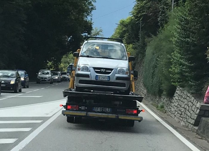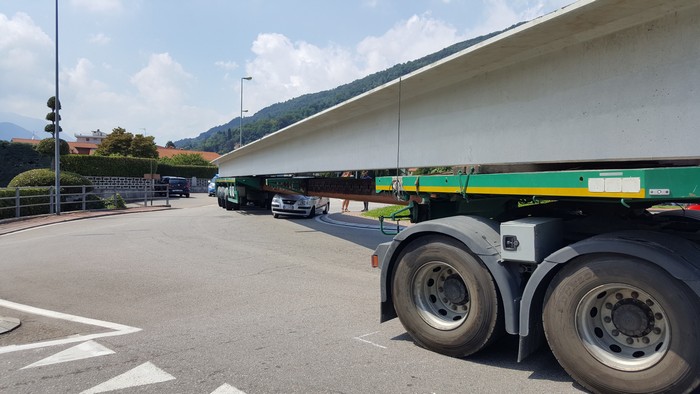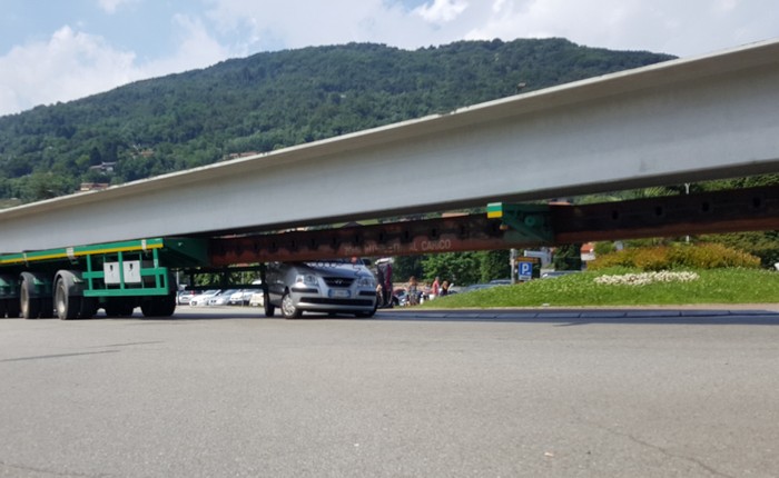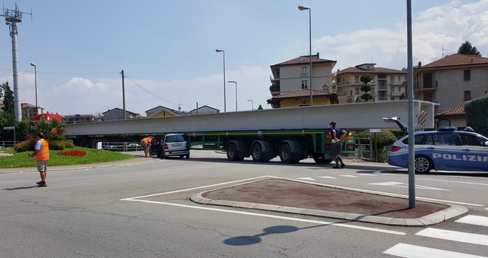 È senza gravi conseguenze ma dalla dinamica spettacolare l’incidente accaduto attorno alle 15 di oggi in corso Nazioni Unite. Proveniente da Fondotoce e diretto al vicino cantiere Lidl, un trasporto eccezionale di travi cementizie prefabbricate regolarmente scortato dai mezzi di assistenza è entrato nella rotonda di fronte alla questura, quella all’angolo con via Zara e il bivio per l’ospedale “Castelli”. La motrice era quasi oltre il rondò, ma il posteriore ancora sulla carreggiata del rettilineo nell’attimo in cui la Hyunday Matiz di colore grigio condotta da un 78enne è andata a sbattere contro il pianale dell’autoarticolato. L’impatto è avvenuto a metà parabrezza e ha immediatamente arrestato il veicolo. L’anziano a fianco del conducente è stato soccorso dal 118 e portato nel vicino nosocomio “Castelli” per accertamenti ma senza apparenti lesioni. Sul posto, per i rilievi, la Polstrada, i cui agenti non hanno dovuto far altro che uscire dall’ufficio e attraversare la strada. Il traffico è stato regolato dal personale al seguito del trasporto eccezionale. Lunghe code si sono registrate sulla statale 34.
