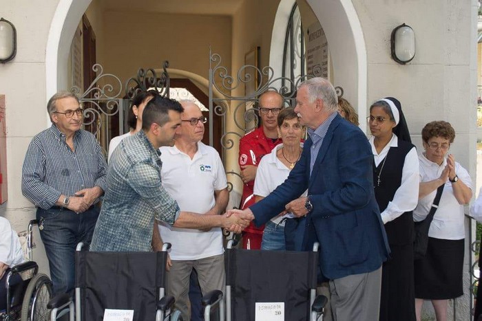 alla casa di riposo di Stresa. Viene dall’Avis e viaggia attraverso il progetto discografico benefico “Ricomincio da 20” il contributo con il quale sono state acquistate due sedie a rotelle destinate a “Casa Tadini”. La cerimonia di consegna s’è tenuta nei giorni scorsi nella casa di risposo stresiana alla presenza della direzione, delle suore di San Giovanni Battista che la gestiscono, degli ospiti e di Salvatore Ranieri, il Cantante della Solidarietà. È sostenendo il nuovo album “Ricomincio da 20” che l’Avis di Stresa è riuscita a raccogliere il denaro necessario, così come aveva fatto in precedenza a Baveno. A effettuare materialmente la consegna è stato il presidente della locale sezione avisina, Gianni Pessina, insieme ai suoi volontari.